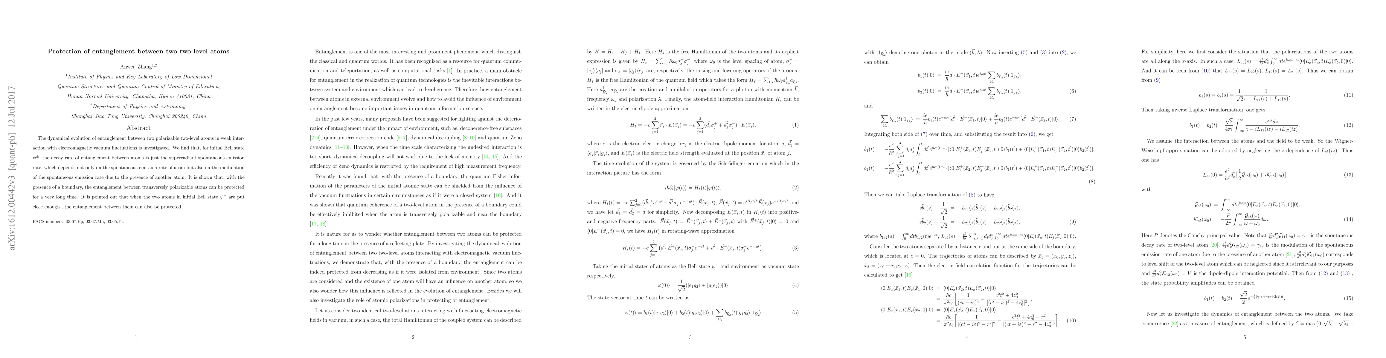 The dynamical evolution of entanglement between two polarizable two-level atoms in weak interaction with electromagnetic vacuum fluctuations is investigated. We find that, for initial Bell state $\psi^{\pm}$, the decay rate of entanglement between atoms is just the superradiant spontaneous emission rate, which depends not only on the spontaneous emission rate of atom but also on the modulation of the spontaneous emission rate due to the presence of another atom. It is shown that, with the presence of a boundary, the entanglement between transversely polarizable atoms can be protected for a very long time. It is pointed out that when the two atoms in initial Bell state $\psi^{-}$ are put close enough , the entanglement between them can also be protected.