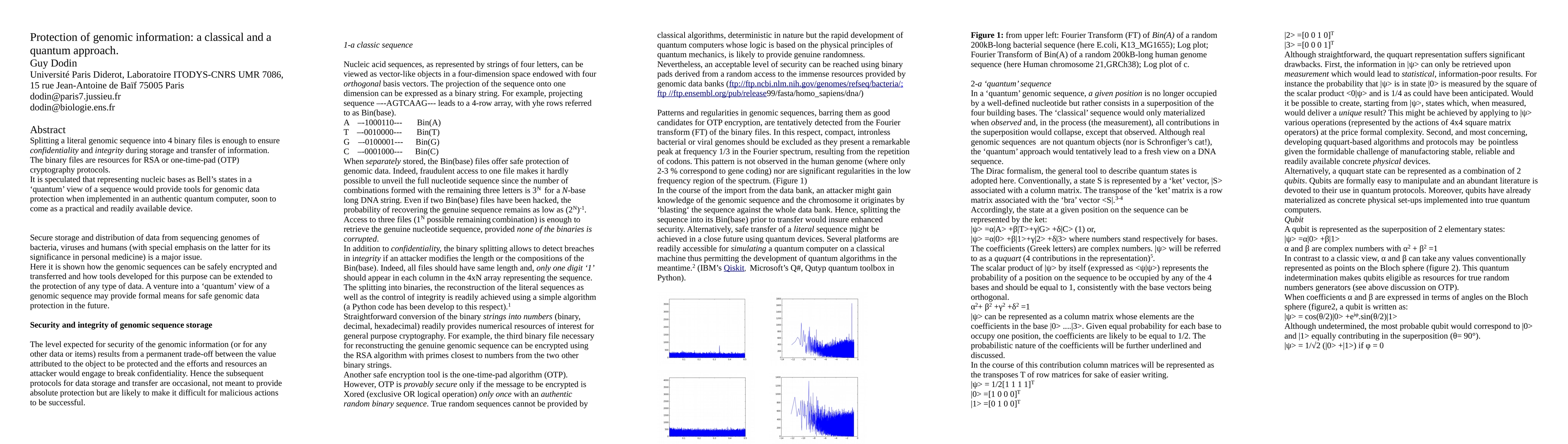 Splitting a literal genomic sequence into 4 binary files is enough to ensure confidentiality and integrity during storage and transfer of information. The binary files are resources for RSA or one-time-pad (OTP) cryptography protocols. It is speculated that representing nucleic bases as Bell states in a quantum view of a sequence would provide tools for genomic data protection when implemented in an authentic quantum computer, soon to come as a practical and readily available device.