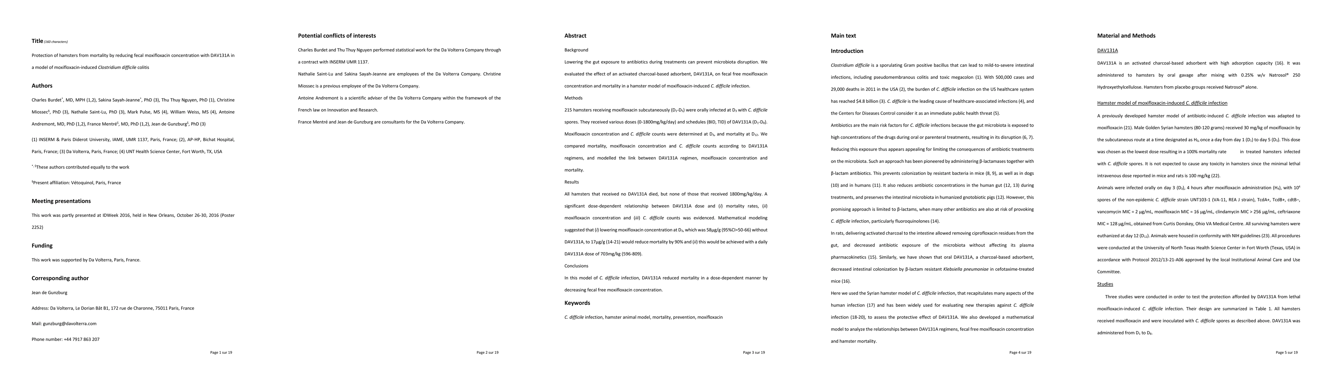 BackgroundLowering the gut exposure to antibiotics during treatments can prevent microbiota disruption. We evaluated the effect of an activated charcoal-based adsorbent, DAV131A, on fecal free moxifloxacin concentration and mortality in a hamster model of moxifloxacin-induced C. difficile infection.Methods215 hamsters receiving moxifloxacin subcutaneously (D1-D5) were orally infected at D3 with C. difficile spores. They received various doses (0-1800mg/kg/day) and schedules (BID, TID) of DAV131A (D1-D8). Moxifloxacin concentration and C. difficile counts were determined at D3, and mortality at D12. We compared mortality, moxifloxacin concentration and C. difficile counts according to DAV131A regimens, and modelled the link between DAV131A regimen, moxifloxacin concentration and mortality. ResultsAll hamsters that received no DAV131A died, but none of those that received 1800mg/kg/day. A significant dose-dependent relationship between DAV131A dose and (i) mortality rates, (ii) moxifloxacin concentration and (iii) C. difficile counts was evidenced. Mathematical modeling suggested that (i) lowering moxifloxacin concentration at D3, which was 58$\mu$g/g (95%CI=50-66) without DAV131A, to 17$\mu$g/g (14-21) would reduce mortality by 90% and (ii) this would be achieved with a daily DAV131A dose of 703mg/kg (596-809).ConclusionsIn this model of C. difficile infection, DAV131A reduced mortality in a dose-dependent manner by decreasing fecal free moxifloxacin concentration.