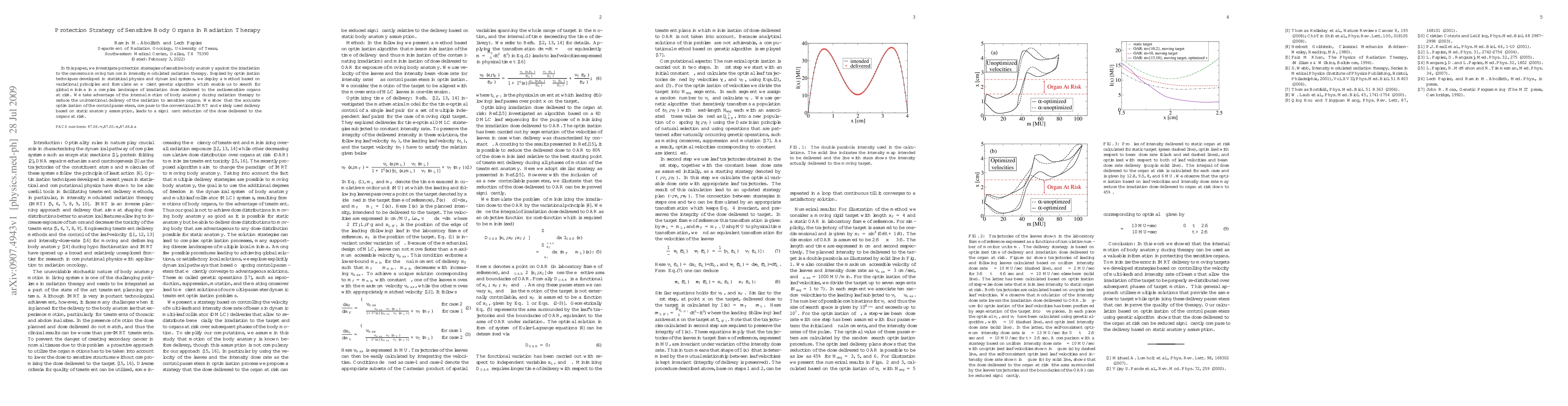 In this paper, we investigate protection strategies of sensitive body anatomy against the irradiation to the cancerous moving tumors in intensity modulated radiation therapy. Inspired by optimization techniques developed in statistical physics and dynamical systems, we deploy a method based on variational principles and formulate an efficient genetic algorithm which enable us to search for global minima in a complex landscape of irradiation dose delivered to the radiosensitive organs at risk. We take advantage of the internal motion of body anatomy during radiation therapy to reduce the unintentional delivery of the radiation to sensitive organs. We show that the accurate optimization of the control parameters, compare to the conventional IMRT and widely used delivery based on static anatomy assumption, leads to a significant reduction of the dose delivered to the organs at risk.