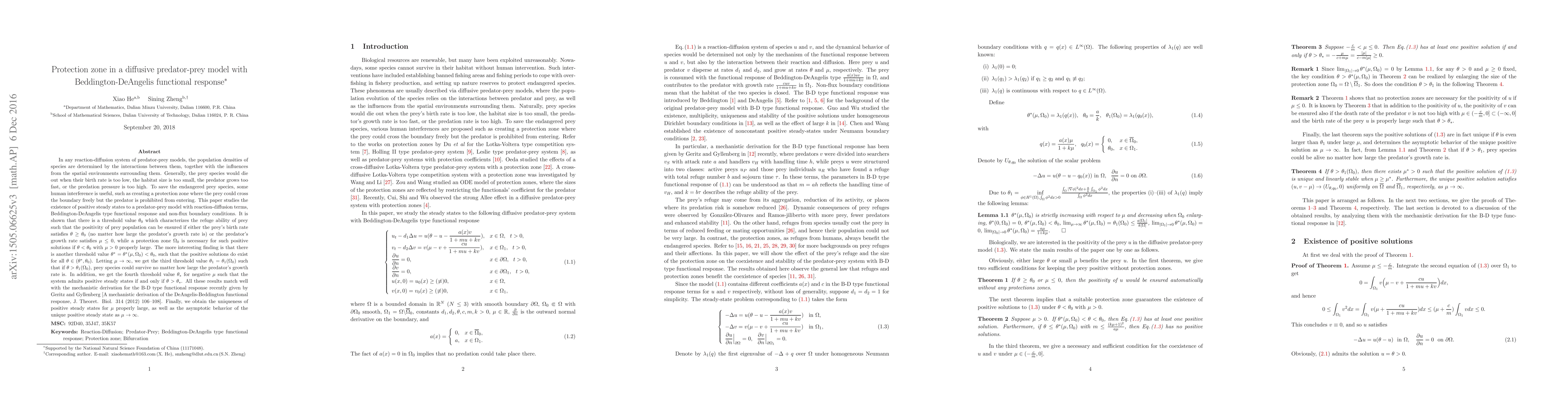 In any reaction-diffusion system of predator-prey models, the population densities of species are determined by the interactions between them, together with the influences from the spatial environments surrounding them. Generally, the prey species would die out when their birth rate is too low, the habitat size is too small, the predator grows too fast, or the predation pressure is too high. To save the endangered prey species, some human interference is useful, such as creating a protection zone where the prey could cross the boundary freely but the predator is prohibited from entering. This paper studies the existence of positive steady states to a predator-prey model with reaction-diffusion terms, Beddington-DeAngelis type functional response and non-flux boundary conditions. It is shown that there is a threshold value $\theta_0$ which characterizes the refuge ability of prey such that the positivity of prey population can be ensured if either the prey's birth rate satisfies $\theta\geq\theta_0$ (no matter how large the predator's growth rate is) or the predator's growth rate satisfies $\mu\le 0$, while a protection zone $\Omega_0$ is necessary for such positive solutions if $\theta<\theta_0$ with $\mu>0$ properly large. The more interesting finding is that there is another threshold value $\theta^*=\theta^*(\mu,\Omega_0)<\theta_0$, such that the positive solutions do exist for all $\theta\in(\theta^*,\theta_0)$. Letting $\mu\rightarrow\infty$, we get the third threshold value $\theta_1=\theta_1(\Omega_0)$ such that if $\theta>\theta_1(\Omega_0)$, prey species could survive no matter how large the predator's growth rate is. In addition, we get the fourth threshold value $\theta_*$ for negative $\mu$ such that the system admits positive steady states if and only if $\theta>\theta_*$.