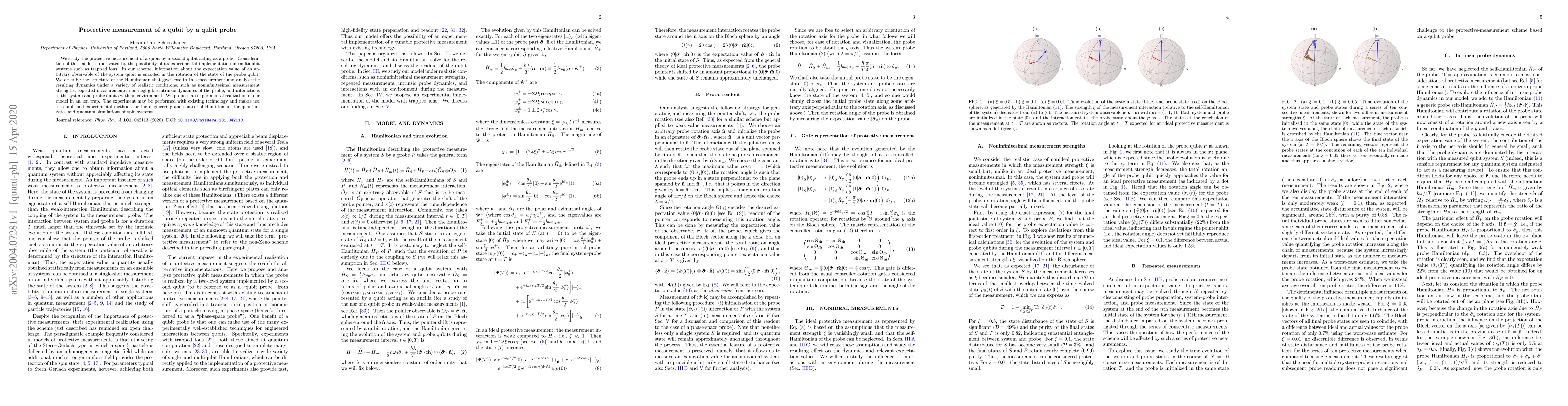 We study the protective measurement of a qubit by a second qubit acting as a probe. Consideration of this model is motivated by the possibility of its experimental implementation in multiqubit systems such as trapped ions. In our scheme, information about the expectation value of an arbitrary observable of the system qubit is encoded in the rotation of the state of the probe qubit. We describe the structure of the Hamiltonian that gives rise to this measurement and analyze the resulting dynamics under a variety of realistic conditions, such as noninfinitesimal measurement strengths, repeated measurements, non-negligible intrinsic dynamics of the probe, and interactions of the system and probe qubits with an environment. We propose an experimental realization of our model in an ion trap. The experiment may be performed with existing technology and makes use of established experimental methods for the engineering and control of Hamiltonians for quantum gates and quantum simulations of spin systems.