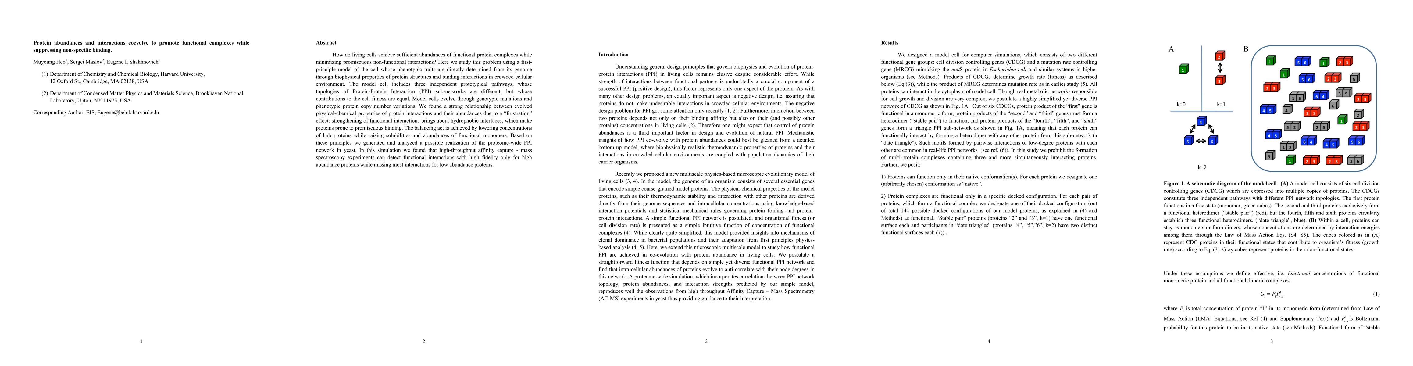 How do living cells achieve sufficient abundances of functional protein complexes while minimizing promiscuous non-functional interactions? Here we study this problem using a first-principle model of the cell whose phenotypic traits are directly determined from its genome through biophysical properties of protein structures and binding interactions in crowded cellular environment. The model cell includes three independent prototypical pathways, whose topologies of Protein-Protein Interaction (PPI) sub-networks are different, but whose contributions to the cell fitness are equal. Model cells evolve through genotypic mutations and phenotypic protein copy number variations. We found a strong relationship between evolved physical-chemical properties of protein interactions and their abundances due to a "frustration" effect: strengthening of functional interactions brings about hydrophobic interfaces, which make proteins prone to promiscuous binding. The balancing act is achieved by lowering concentrations of hub proteins while raising solubilities and abundances of functional monomers. Based on these principles we generated and analyzed a possible realization of the proteome-wide PPI network in yeast. In this simulation we found that high-throughput affinity capture - mass spectroscopy experiments can detect functional interactions with high fidelity only for high abundance proteins while missing most interactions for low abundance proteins.