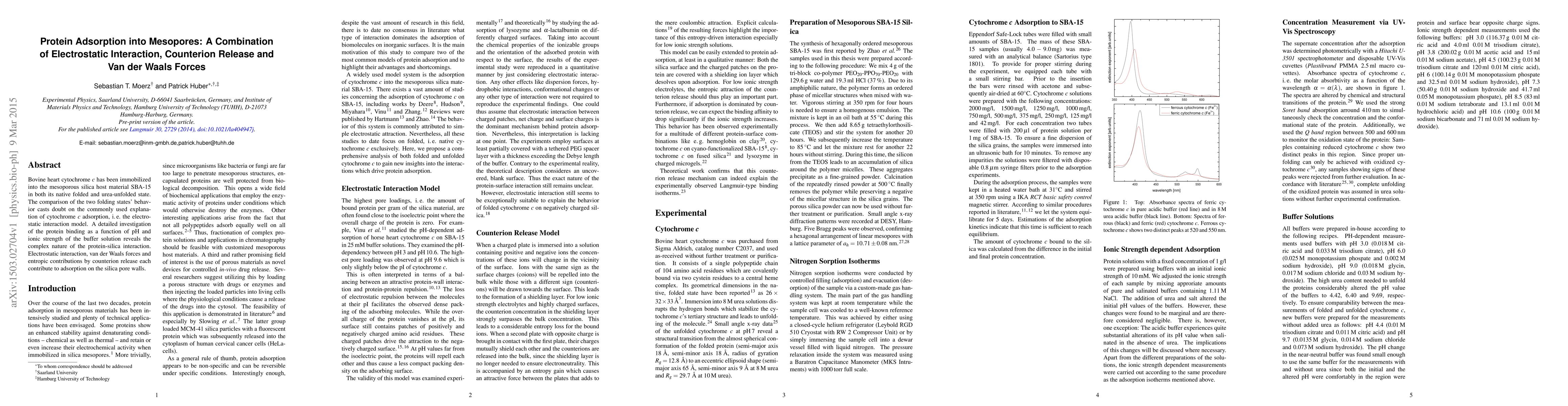 This study investigates the adsorption of bovine heart cytochrome c into mesoporous silica SBA-15, revealing that both electrostatic interaction and counterion release, along with van der Waals forces, play significant roles in protein binding, challenging the traditional electrostatic interaction model. The findings highlight the complexity of protein-silica interactions influenced by pH and ionic strength.
