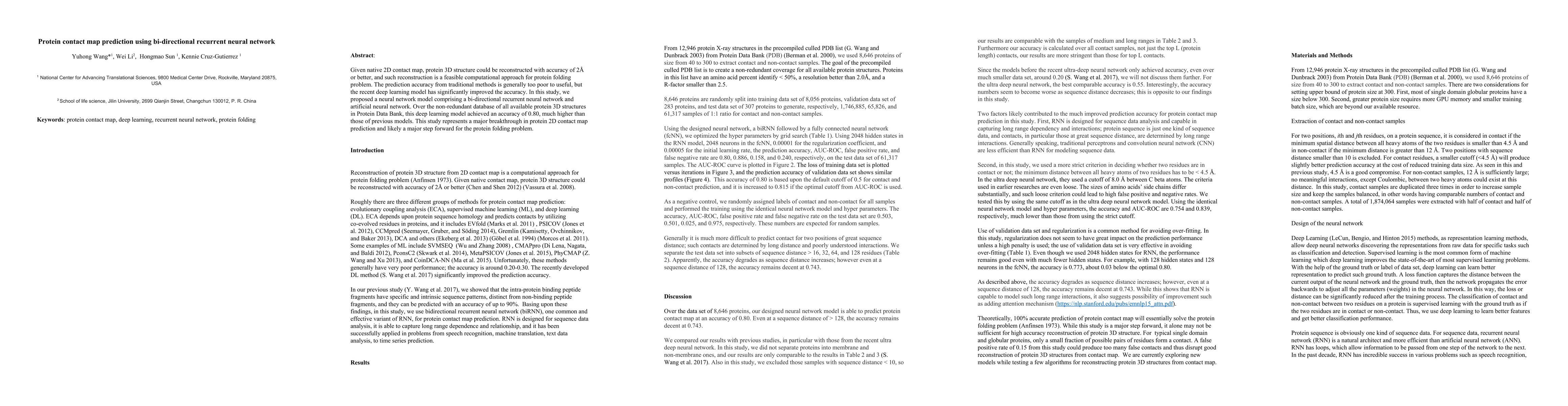 Given native 2D contact map, protein 3D structure could be reconstructed with accuracy of 2A or better, and such reconstruction is a feasible computational approach for protein folding problem. The prediction accuracy from traditional methods is generally too poor to useful, but the recent deep learning model has significantly improved the accuracy. In this study, we proposed a neural network model comprising a bi-directional recurrent neural network and artificial neural network. Over the non-redundant database of all available protein 3D structures in Protein Data Bank, this deep learning model achieved an accuracy of 0.80, much higher than those of previous models. This study represents a major breakthrough in protein 2D contact map prediction and likely a major step forward for the protein folding problem.
