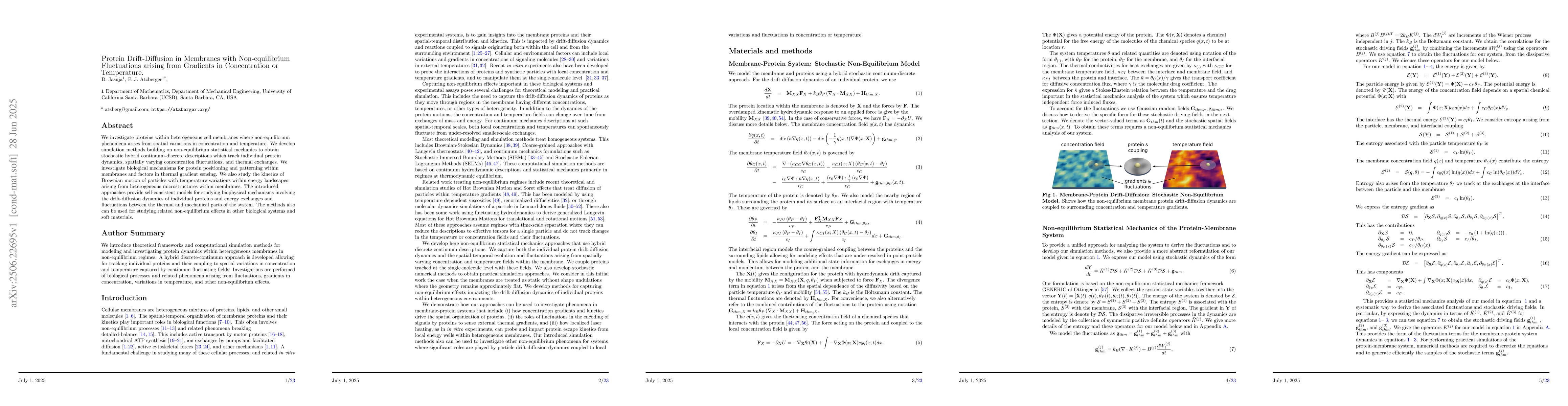 We investigate proteins within heterogeneous cell membranes where non-equilibrium phenomena arises from spatial variations in concentration and temperature. We develop simulation methods building on non-equilibrium statistical mechanics to obtain stochastic hybrid continuum-discrete descriptions which track individual protein dynamics, spatially varying concentration fluctuations, and thermal exchanges. We investigate biological mechanisms for protein positioning and patterning within membranes and factors in thermal gradient sensing. We also study the kinetics of Brownian motion of particles with temperature variations within energy landscapes arising from heterogeneous microstructures within membranes. The introduced approaches provide self-consistent models for studying biophysical mechanisms involving the drift-diffusion dynamics of individual proteins and energy exchanges and fluctuations between the thermal and mechanical parts of the system. The methods also can be used for studying related non-equilibrium effects in other biological systems and soft materials.