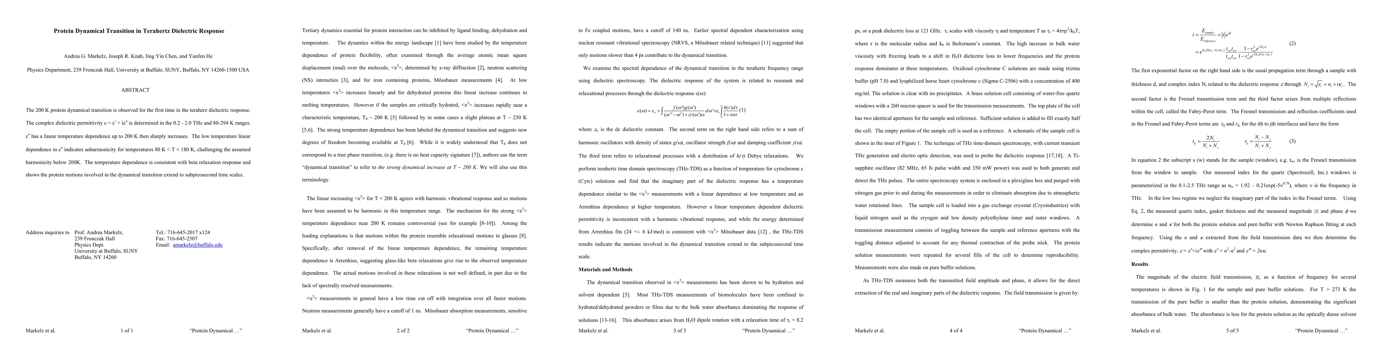 Researchers observed a dynamic transition in protein dielectric response at 200 K, challenging the assumption of harmonicity below this temperature. This finding is consistent with beta relaxation responses and indicates subpicosecond protein motions involved in the transition.