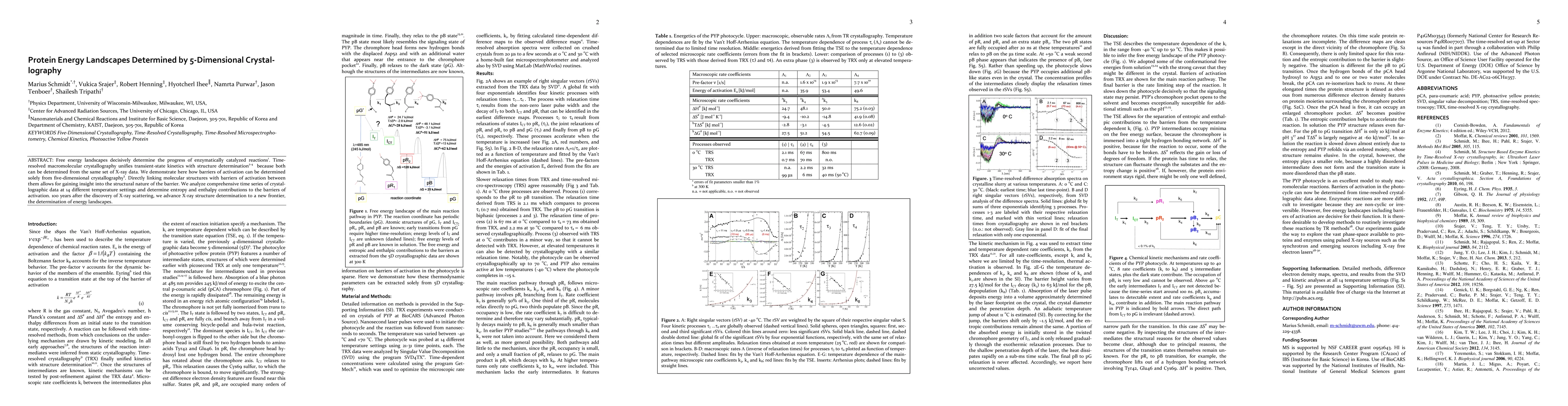 Free energy landscapes decisively determine the progress of enzymatically catalyzed reactions[1]. Time-resolved macromolecular crystallography unifies transient-state kinetics with structure determination [2-4] because both can be determined from the same set of X-ray data. We demonstrate here how barriers of activation can be determined solely from five-dimensional crystallography [5]. Directly linking molecular structures with barriers of activation between them allows for gaining insight into the structural nature of the barrier. We analyze comprehensive time series of crystal-lographic data at 14 different temperature settings and determine entropy and enthalpy contributions to the barriers of activation. 100 years after the discovery of X-ray scattering, we advance X-ray structure determination to a new frontier, the determination of energy landscapes.