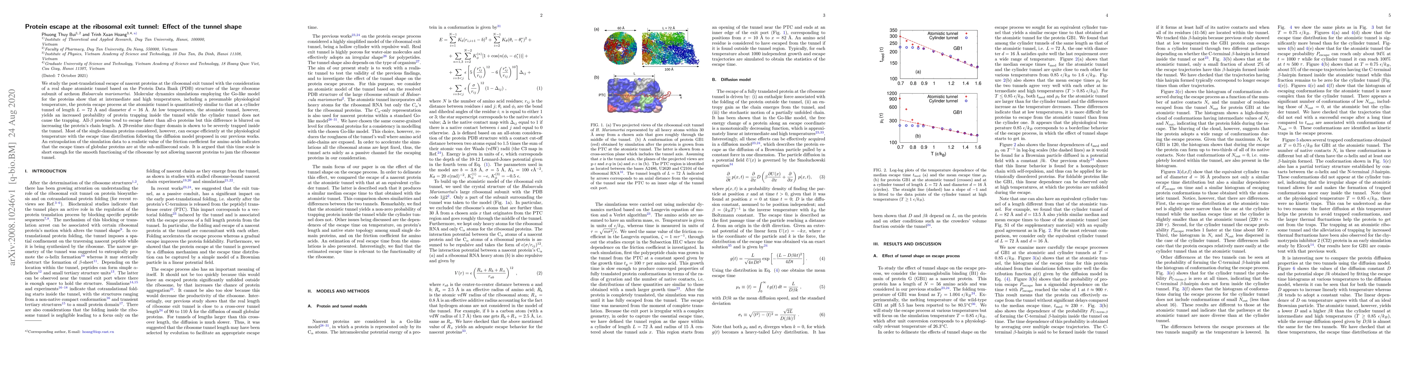 We study the post-translational escape of nascent proteins at the ribosomal exit tunnel with the consideration of a real shape atomistic tunnel based on the Protein Data Bank (PDB) structure of the large ribosome subunit of archeon Haloarcula marismortui. Molecular dynamics simulations employing the Go-like model for the proteins show that at intermediate and high temperatures, including a presumable physiological temperature, the protein escape process at the atomistic tunnel is quantitatively similar to that at a cylinder tunnel of length L = 72 {\AA} and diameter d = 16 {\AA}. At low temperatures, the atomistic tunnel, however, yields an increased probability of protein trapping inside the tunnel while the cylinder tunnel does not cause the trapping. All-$\beta$ proteins tend to escape faster than all-$\alpha$ proteins but this difference is blurred on increasing the protein's chain length. A 29-residue zinc-finger domain is shown to be severely trapped inside the tunnel. Most of the single-domain proteins considered, however, can escape efficiently at the physiological temperature with the escape time distribution following the diffusion model proposed in our previous works. An extrapolation of the simulation data to a realistic value of the friction coefficient for amino acids indicates that the escape times of globular proteins are at the sub-millisecond scale. It is argued that this time scale is short enough for the smooth functioning of the ribosome by not allowing nascent proteins to jam the ribosome tunnel.