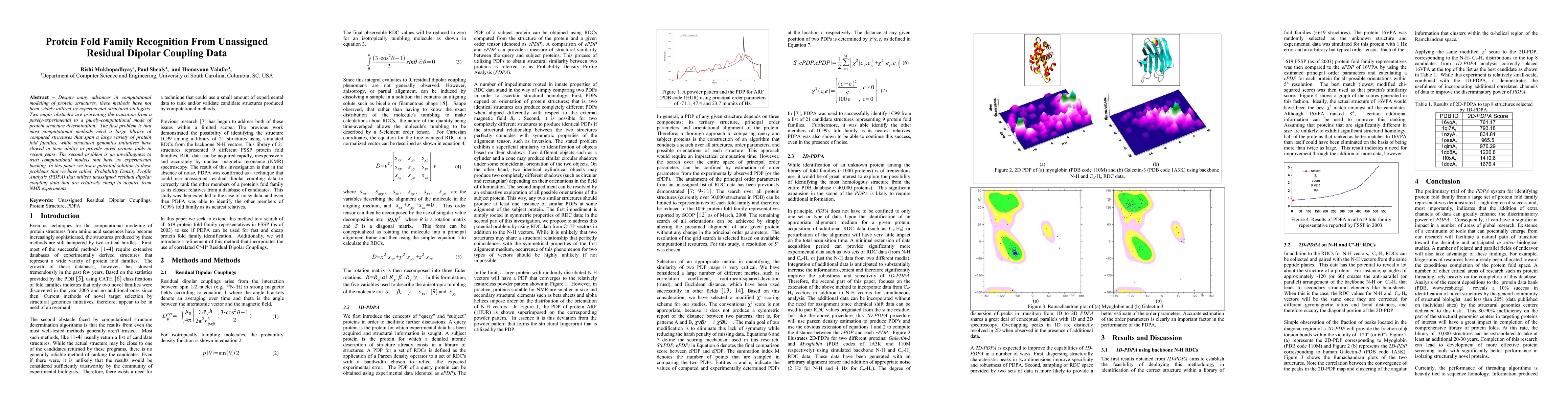 This paper proposes Probability Density Profile Analysis (PDPA) to recognize protein fold families using unassigned residual dipolar coupling data from NMR experiments, aiming to address the lack of computational methods backed by experimental data and the decline in novel protein fold discoveries. PDPA seeks to bridge the gap between computational modeling and experimental structural biology.