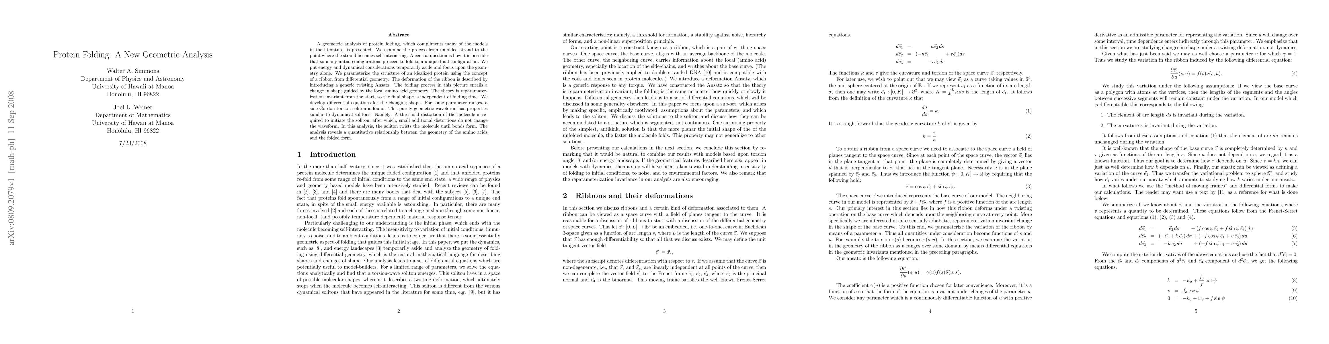 A geometric analysis of protein folding, which complements many of the models in the literature, is presented. We examine the process from unfolded strand to the point where the strand becomes self-interacting. A central question is how it is possible that so many initial configurations proceed to fold to a unique final configuration. We put energy and dynamical considerations temporarily aside and focus upon the geometry alone. We parameterize the structure of an idealized protein using the concept of a ribbon from differential geometry. The deformation of the ribbon is described by introducing a generic twisting Ansatz. The folding process in this picture entails a change in shape guided by the local amino acid geometry. The theory is reparamaterization invariant from the start, so the final shape is independent of folding time. We develop differential equations for the changing shape. For some parameter ranges, a sine-Gordon torsion soliton is found. This purely geometric waveform has properties similar to dynamical solitons. Namely: A threshold distortion of the molecule is required to initiate the soliton, after which, small additional distortions do not change the waveform. In this analysis, the soliton twists the molecule until bonds form. The analysis reveals a quantitative relationship between the geometry of the amino acids and the folded form.