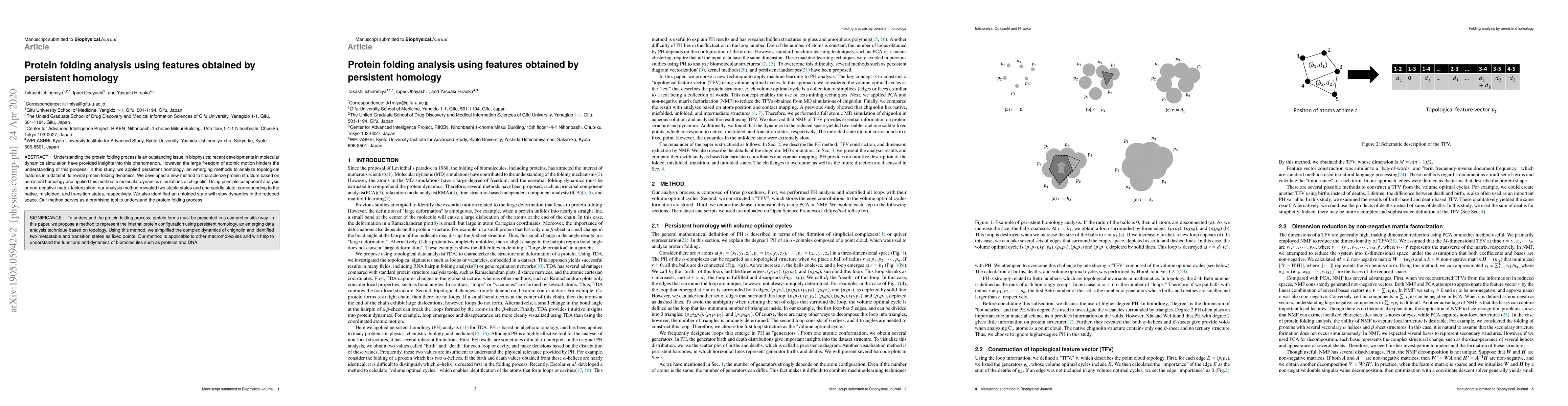 Understanding the protein folding process is an outstanding issue in biophysics; recent developments in molecular dynamics simulation have provided insights into this phenomenon. However, the large freedom of atomic motion hinders the understanding of this process. In this study, we applied persistent homology, an emerging methods to analyze topological features in a dataset, to reveal protein folding dynamics. We developed a new method to characterize protein structure based on persistent homology and applied this method to molecular dynamics simulations of chignolin. Using principle component analysis or non-negative matrix factorization, our analysis method revealed two stable states and one saddle state, corresponding to the native, misfolded, and transition states, respectively. We also identified an unfolded state with slow dynamics in the reduced space. Our method serves as a promising tool to understand the protein folding process.