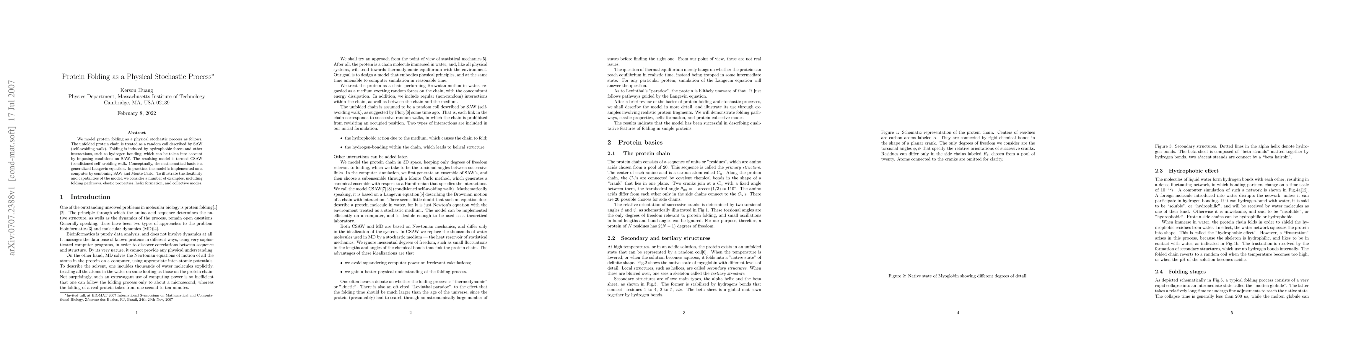 We model protein folding as a physical stochastic process as follows. The unfolded protein chain is treated as a random coil described by SAW (self-avoiding walk). Folding is induced by hydrophobic forces and other interactions, such as hydrogen bonding, which can be taken into account by imposing conditions on SAW. The resulting model is termed CSAW (conditioned self-avoiding walk. Conceptually, the mathematical basis is a generalized Langevin equation. In practice, the model is implemented on a computer by combining SAW and Monte Carlo. To illustrate the flexibility and capabilities of the model, we consider a number of examples, including folding pathways, elastic properties, helix formation, and collective modes.