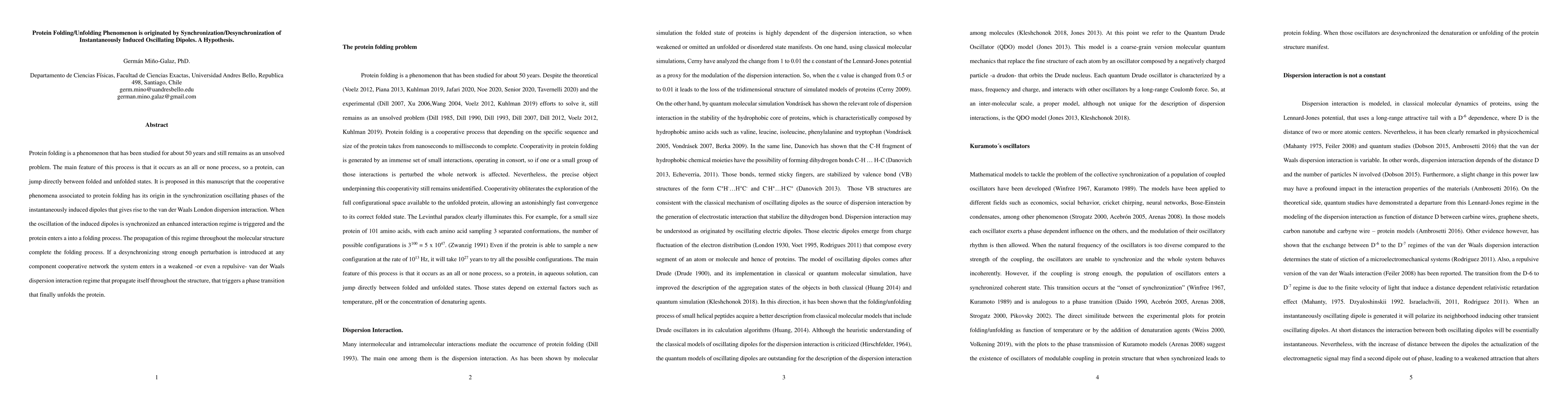 This paper hypothesizes that protein folding/unfolding is driven by the synchronization or desynchronization of oscillating dipoles, leading to enhanced or weakened van der Waals interactions, respectively. The synchronization triggers folding, while desynchronization initiates unfolding.