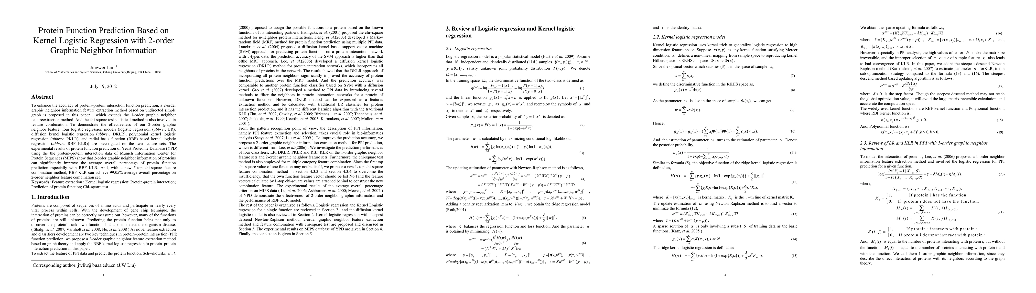 A new method for protein function prediction using 2-order graphic neighbor information improves accuracy, especially with RBF KLR, achieving an average overall percentage of 99.05%.