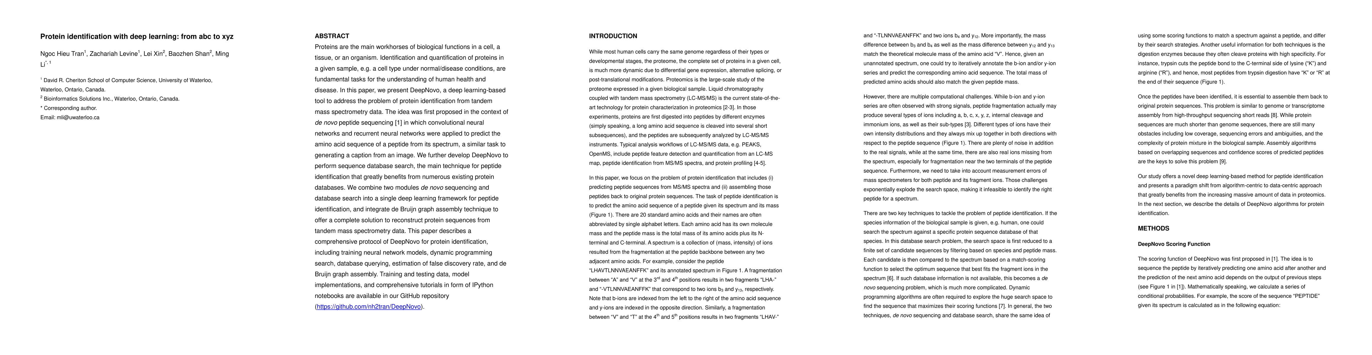 This paper introduces DeepNovo, a deep learning tool for protein identification from mass spectrometry data. It combines de novo sequencing and database search into a single framework, using convolutional and recurrent neural networks, and integrates de Bruijn graph assembly for complete protein sequence reconstruction. The methodology, training data, models, and tutorials are available on GitHub.