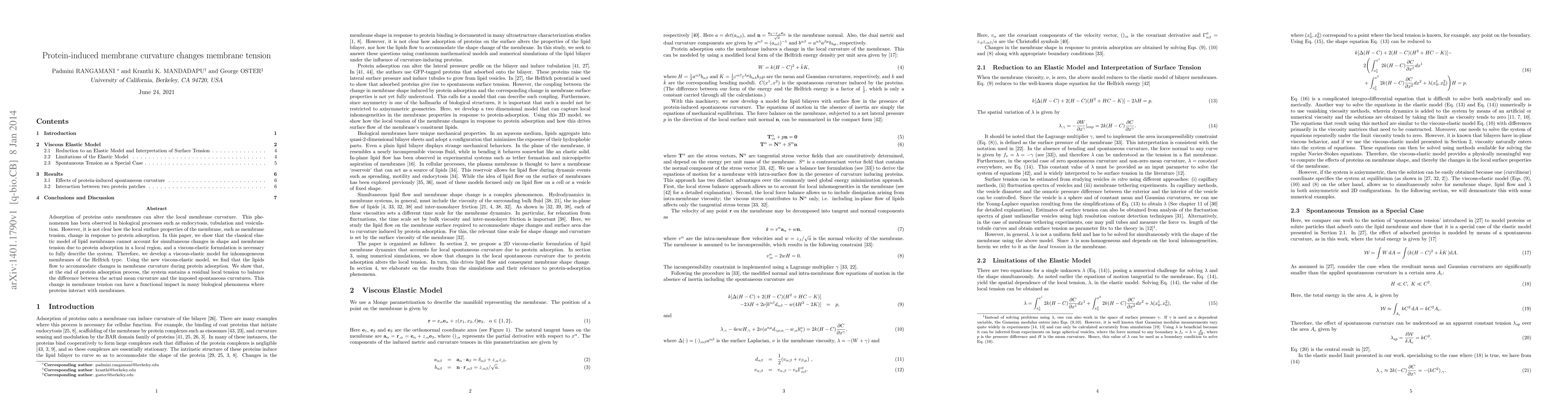 This paper develops a viscous-elastic model to describe how protein adsorption alters membrane curvature and induces changes in membrane tension, revealing that lipids flow to accommodate these changes and a residual local tension is maintained to balance the curvature difference.