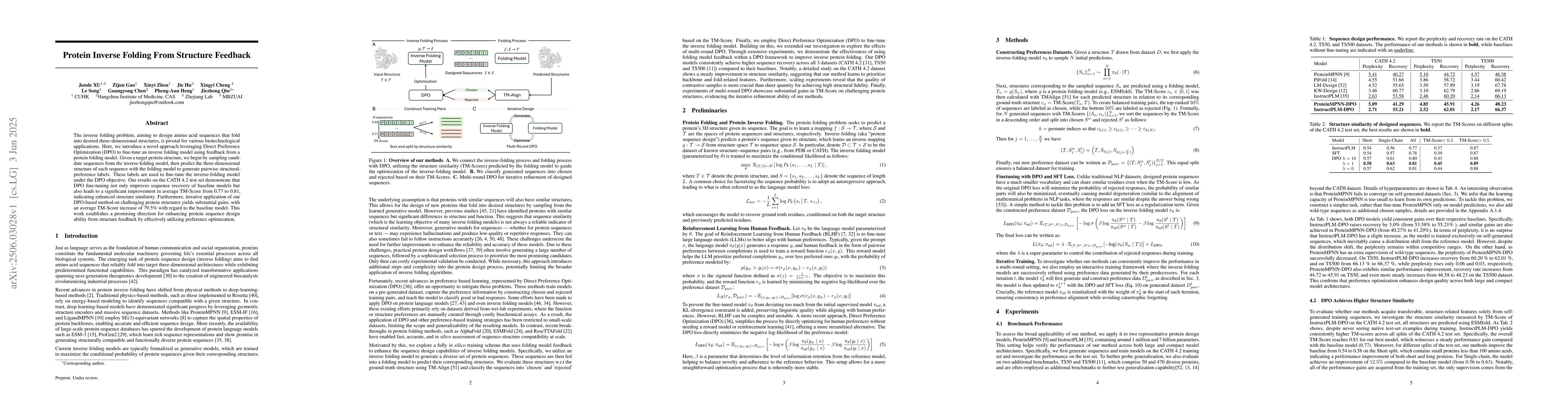 The inverse folding problem, aiming to design amino acid sequences that fold into desired three-dimensional structures, is pivotal for various biotechnological applications. Here, we introduce a novel approach leveraging Direct Preference Optimization (DPO) to fine-tune an inverse folding model using feedback from a protein folding model. Given a target protein structure, we begin by sampling candidate sequences from the inverse-folding model, then predict the three-dimensional structure of each sequence with the folding model to generate pairwise structural-preference labels. These labels are used to fine-tune the inverse-folding model under the DPO objective. Our results on the CATH 4.2 test set demonstrate that DPO fine-tuning not only improves sequence recovery of baseline models but also leads to a significant improvement in average TM-Score from 0.77 to 0.81, indicating enhanced structure similarity. Furthermore, iterative application of our DPO-based method on challenging protein structures yields substantial gains, with an average TM-Score increase of 79.5\% with regard to the baseline model. This work establishes a promising direction for enhancing protein sequence design ability from structure feedback by effectively utilizing preference optimization.