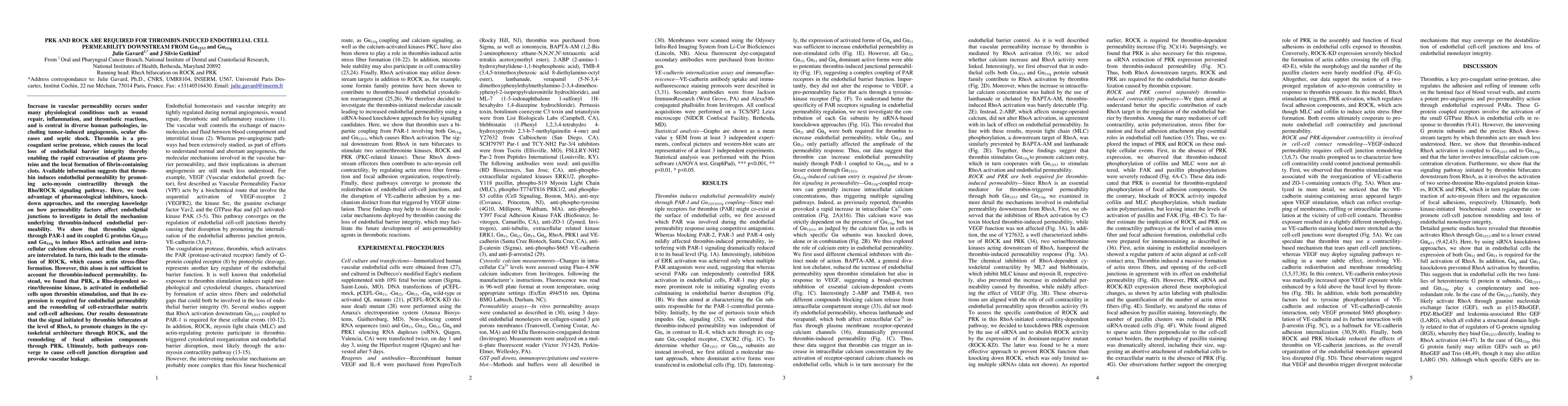 This study reveals that thrombin-induced endothelial permeability involves RhoA activation and calcium elevation through G12/13 and G11/q proteins, leading to ROCK and PRK activation. Both pathways are essential for actin stress-fiber formation and disruption of cell-cell junctions, ultimately causing vascular leakage.