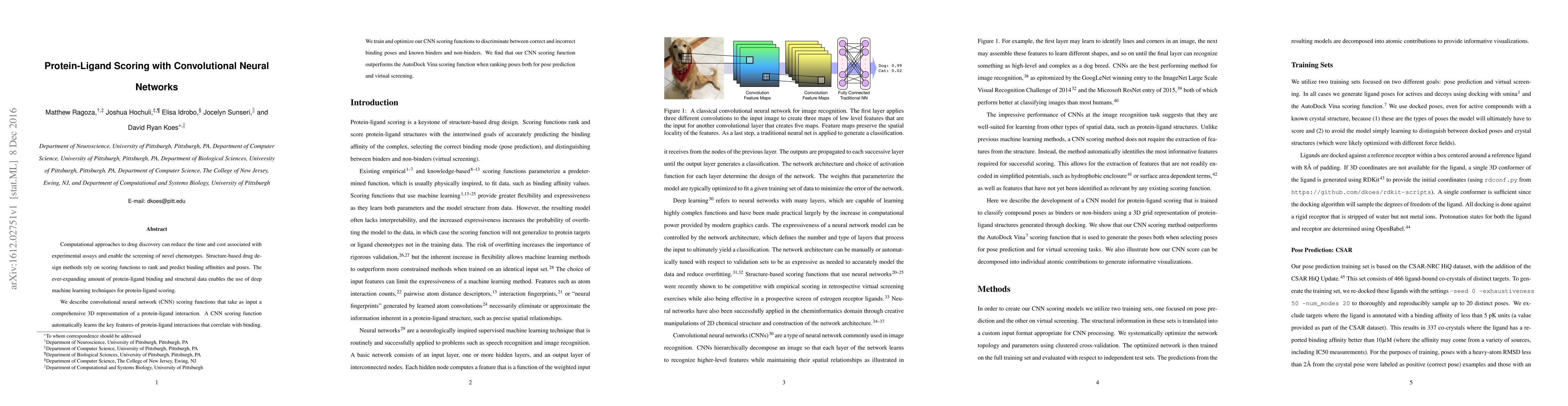 This research introduces a novel approach using CNNs for protein-ligand scoring, which outperforms traditional methods like AutoDock Vina in pose prediction and virtual screening tasks.