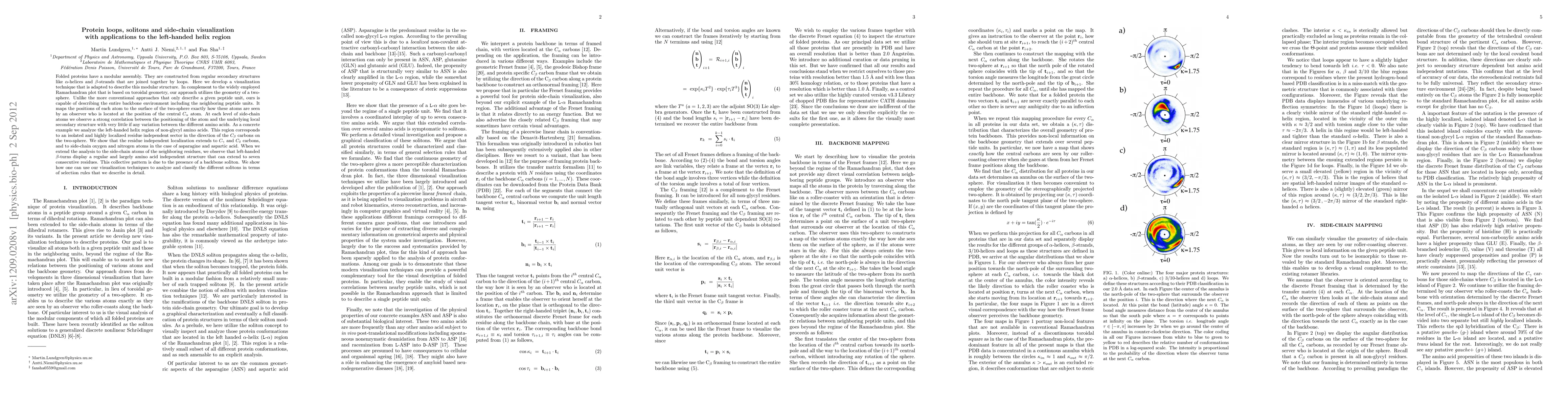 Folded proteins have a modular assembly. They are constructed from regular secondary structures like alpha-helices and beta-strands that are joined together by loops. Here we develop a visualization technique that is adapted to describe this modular structure. In complement to the widely employed Ramachandran plot that is based on toroidal geometry, our approach utilizes the geometry of a two-sphere. Unlike the more conventional approaches that only describea given peptide unit, ours is capable of describing the entire backbone environment including the neighboring peptide units. It maps the positions of each atom to the surface of the two-sphere exactly how these atoms are seen by an observer who is located at the position of the central C-alpha atom. At each level of side-chain atoms we observe a strong correlation between the positioning of the atom and the underlying local secondary structure with very little if any variation between the different amino acids. As a concrete example we analyze the left-handed helix region of non-glycyl amino acids. This region corresponds to an isolated and highly localized residue independent sector in the direction of the C-beta carbons on the two-sphere. We show that the residue independent localization extends to C-gamma and C-delta carbons, and to side-chain oxygen and nitrogen atoms in the case of asparagine and aspartic acid. When we extend the analysis to the side-chain atoms of the neighboring residues, we observe that left-handed beta-turns display a regular and largely amino acid independent structure that can extend to seven consecutive residues. This collective pattern is duu to the presence of a backbone soliton. We show how one can use our visualization techniques to analyze and classify the different solitons in terms of selection rules that we describe in detail.