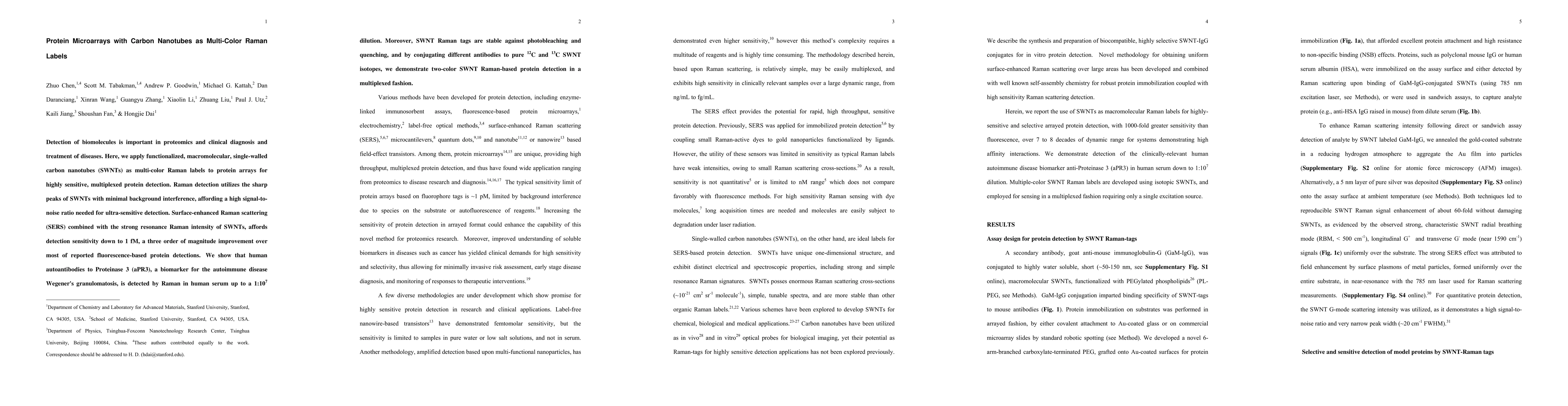 This paper presents a novel method for highly sensitive, multiplexed protein detection using functionalized single-walled carbon nanotubes (SWNTs) as multi-color Raman labels on protein microarrays. The approach achieves detection sensitivity down to 1 fM, significantly improving upon fluorescence-based methods, and demonstrates stable, photobleaching-resistant detection of biomarkers in diluted human serum.