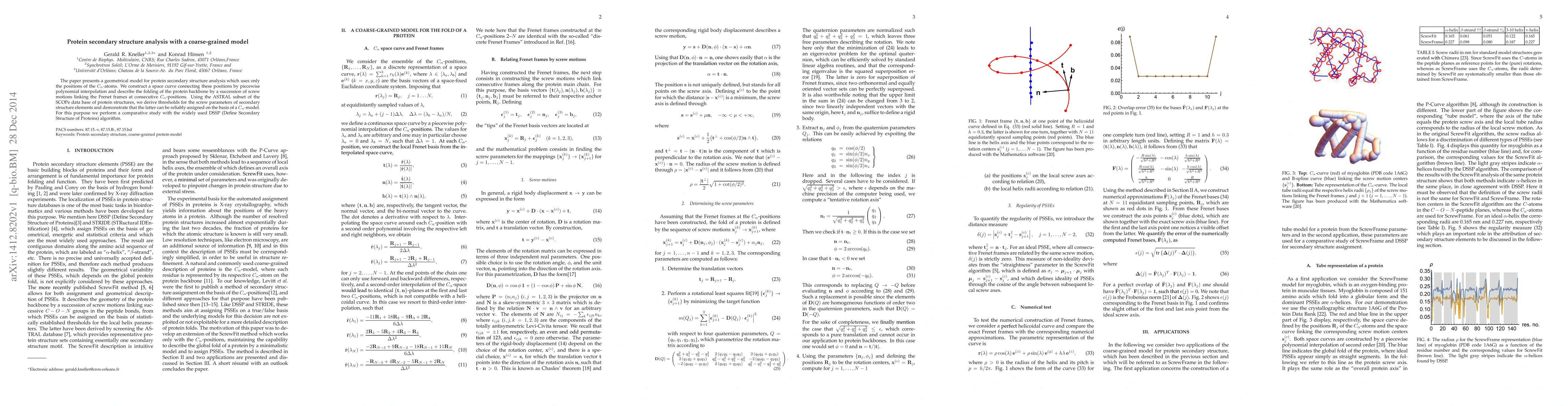 This paper introduces a geometrical model for protein secondary structure analysis based on $C_{\alpha}$-atom positions, employing screw motions and Frenet frames. It establishes thresholds for secondary structure elements and compares its accuracy with the DSSP algorithm using the ASTRAL subset of the SCOPe database.