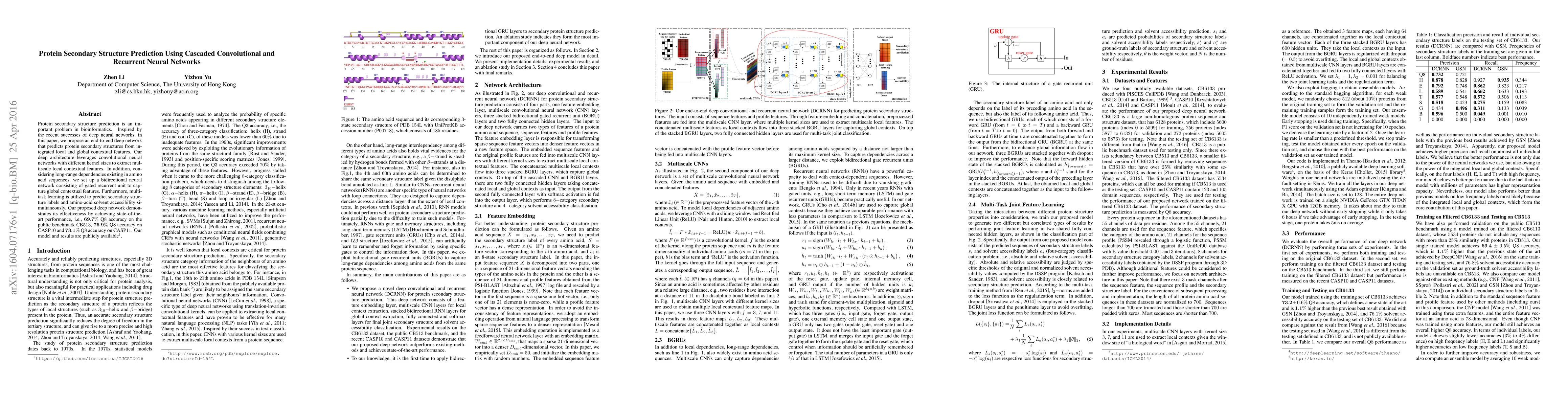 This paper proposes a deep neural network combining convolutional and recurrent layers to predict protein secondary structures, achieving state-of-the-art performance on multiple benchmarks. The model uses multi-task learning to simultaneously predict secondary structures and amino-acid solvent accessibility.