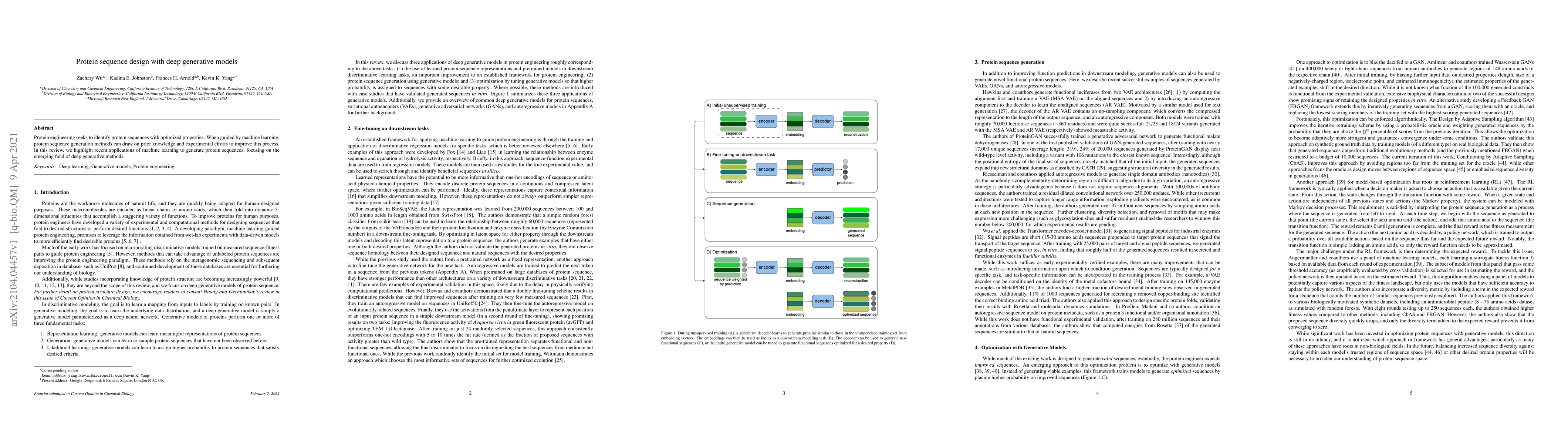 This paper reviews recent advancements in protein sequence design using machine learning, with a particular focus on deep generative models that leverage prior knowledge and experimental data to optimize protein properties. The review highlights the potential of these methods to revolutionize protein engineering.
