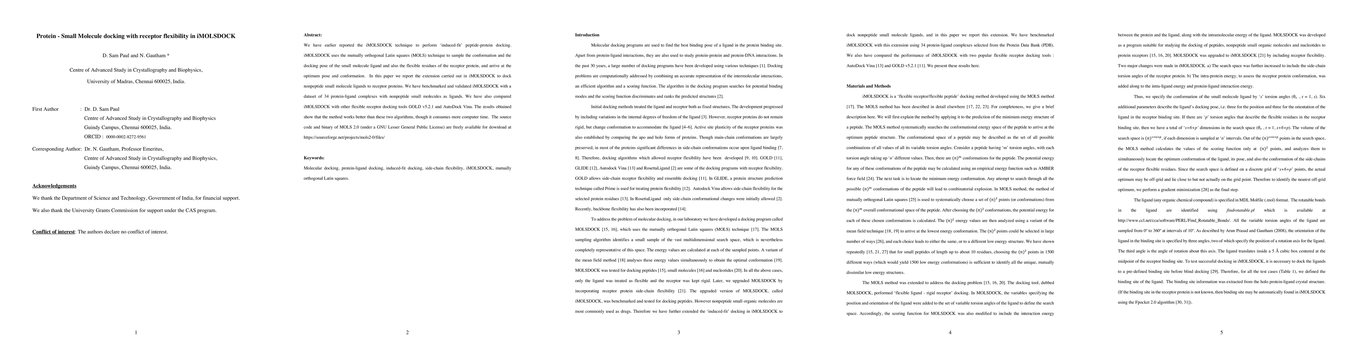 This paper extends iMOLSDOCK to dock nonpeptide small molecules to flexible receptor proteins using the mutually orthogonal Latin squares technique. Benchmarking against 34 protein-ligand complexes shows iMOLSDOCK outperforms GOLD v5.2.1 and AutoDock Vina, though it requires more computational time.