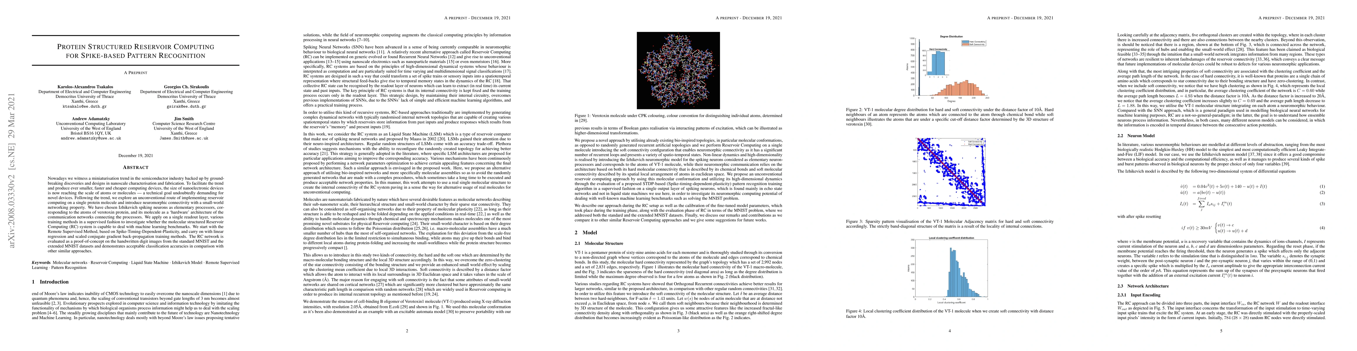 Nowadays we witness a miniaturisation trend in the semiconductor industry backed up by groundbreaking discoveries and designs in nanoscale characterisation and fabrication. To facilitate the trend and produce ever smaller, faster and cheaper computing devices, the size of nanoelectronic devices is now reaching the scale of atoms or molecules - a technical goal undoubtedly demanding for novel devices. Following the trend, we explore an unconventional route of implementing a reservoir computing on a single protein molecule and introduce neuromorphic connectivity with a small-world networking property. We have chosen Izhikevich spiking neurons as elementary processors, corresponding to the atoms of verotoxin protein, and its molecule as a 'hardware' architecture of the communication networks connecting the processors. We apply on a single readout layer various training methods in a supervised fashion to investigate whether the molecular structured Reservoir Computing (RC) system is capable to deal with machine learning benchmarks. We start with the Remote Supervised Method, based on Spike-Timing-Dependent-Plasticity, and carry on with linear regression and scaled conjugate gradient back-propagation training methods. The RC network is evaluated as a proof-of-concept on the handwritten digit images from the MNIST dataset and demonstrates acceptable classification accuracy in comparison with other similar approaches.