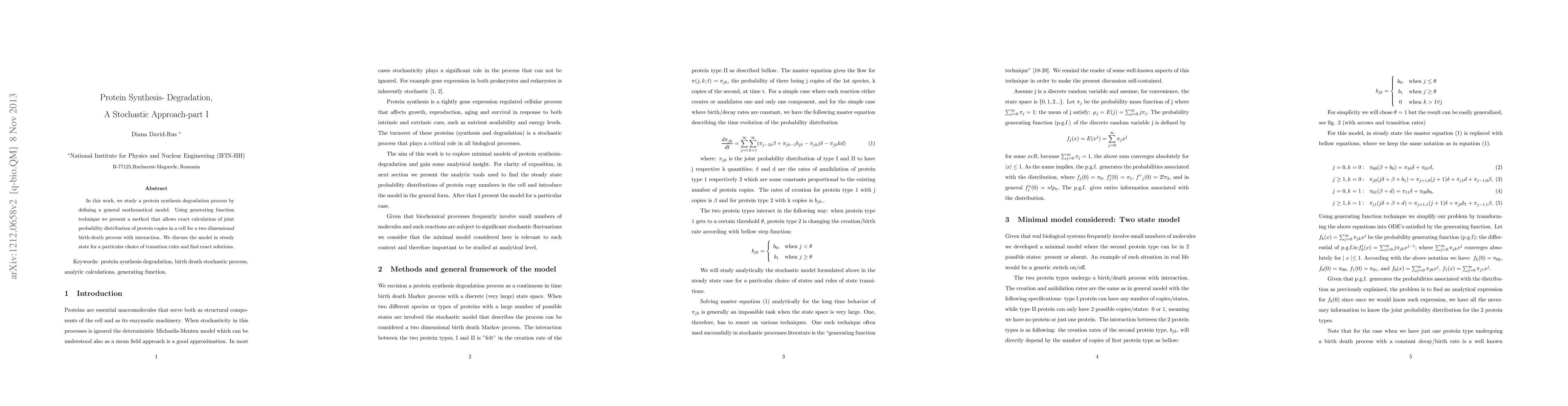 This paper develops a mathematical model for protein synthesis and degradation using a generating function technique to calculate the joint probability distribution of protein copies in a cell. It finds exact solutions for the steady state of a two-dimensional birth-death process with interactions.