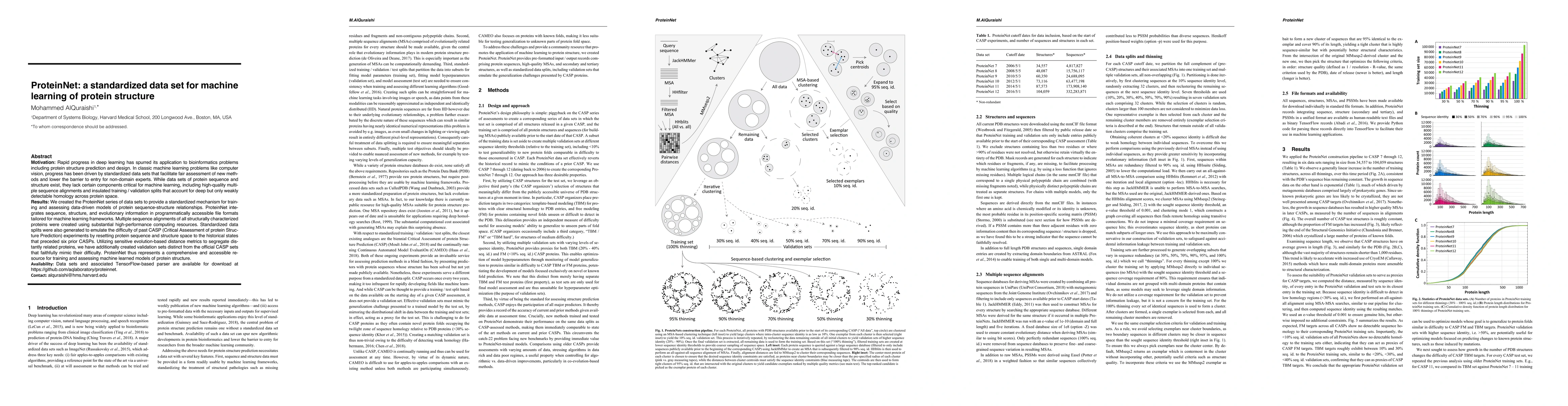 ProteinNet provides a standardized dataset for machine learning in protein structure prediction, integrating sequence, structure, and evolutionary data with high-quality multiple sequence alignments and insulated training/validation splits. It aims to lower the entry barrier for non-experts and facilitate fair assessment of new methods in protein structure modeling.