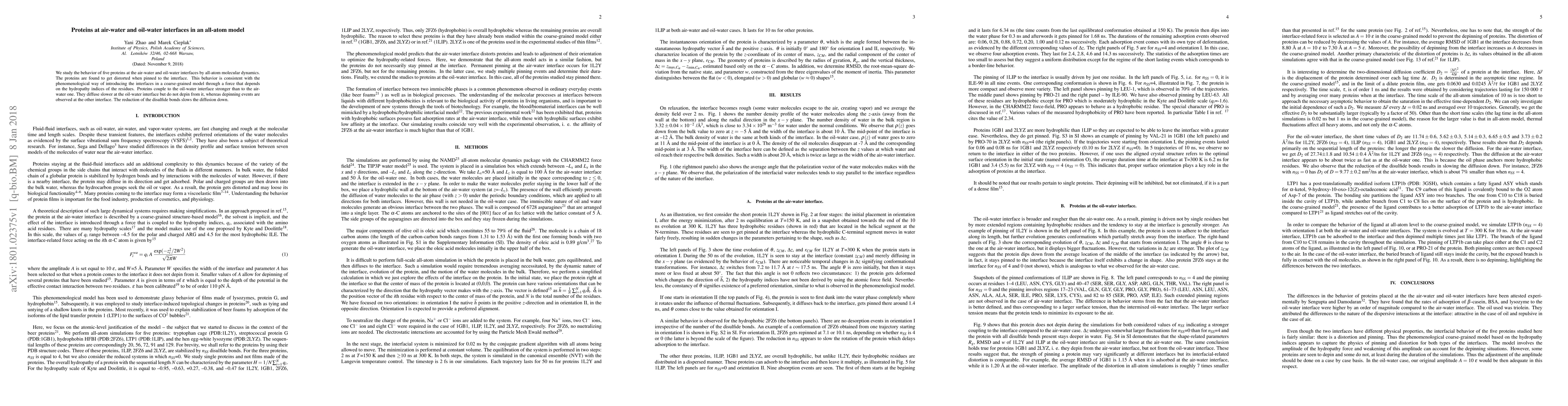 We study the behavior of five proteins at the air-water and oil-water interfaces by all-atom molecular dynamics. The proteins are found to get distorted when pinned to the interface. This behavior is consistent with the phenomenological way of introducing the interfaces in a coarse-grained model through a force that depends on the hydropathy indices of the residues. Proteins couple to the oil-water interface stronger than to the air- water one. They diffuse slower at the oil-water interface but do not depin from it, whereas depinning events are observed at the other interface. The reduction of the disulfide bonds slows the diffusion down.