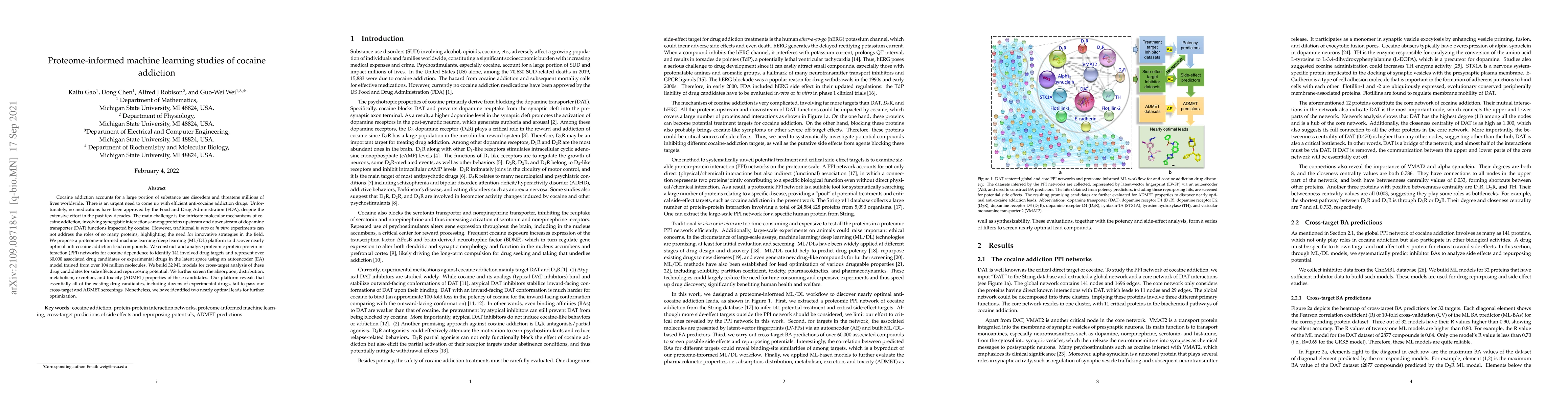 This research proposes a proteome-informed machine learning platform to identify potential anti-cocaine addiction drugs by analyzing proteomic protein-protein interaction networks and screening over 60,000 drug candidates. Despite identifying promising leads, existing drug candidates largely fail cross-target and ADMET screenings.