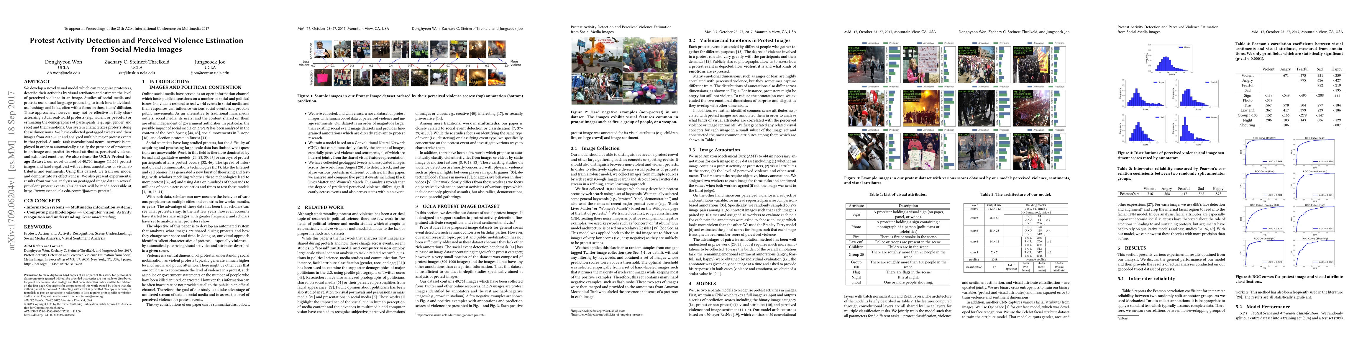 This research introduces a visual model to detect protest activity and estimate perceived violence from social media images, addressing gaps in current text-based approaches. The model uses a multi-task convolutional neural network to classify protesters, predict visual attributes, and assess emotions, supported by a new dataset of geotagged protest images.