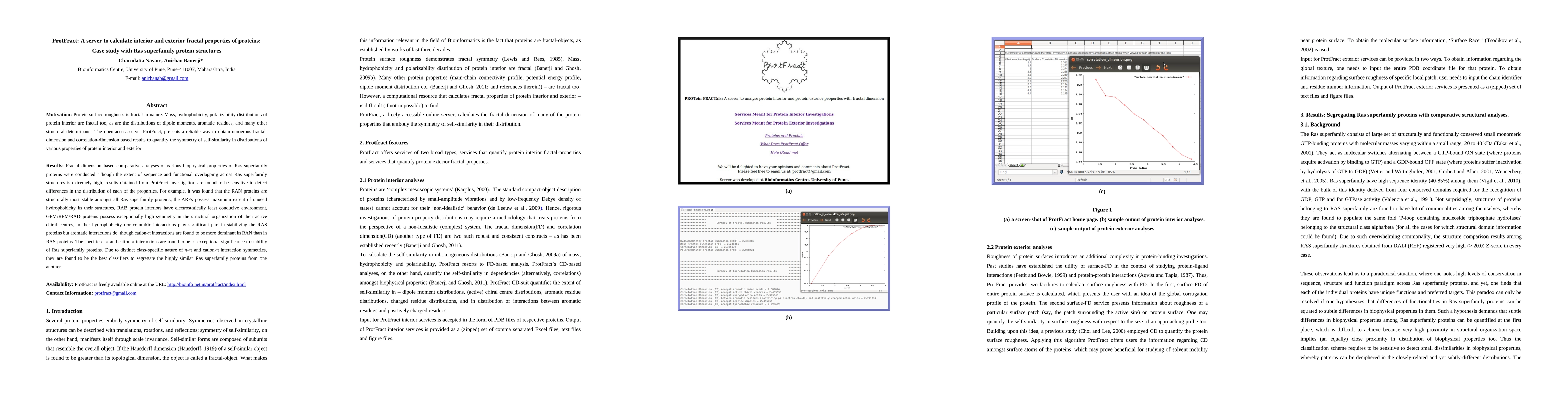 Motivation: Protein surface roughness is fractal in nature. Mass, hydrophobicity, polarizability distributions of protein interior are fractal too, as are the distributions of dipole moments, aromatic residues, and many other structural determinants. The open-access server ProtFract, presents a reliable way to obtain numerous fractal-dimension and correlation-dimension based results to quantify the symmetry of self-similarity in distributions of various properties of protein interior and exterior. Results: Fractal dimension based comparative analyses of various biophysical properties of Ras superfamily proteins were conducted. Though the extent of sequence and functional overlapping across Ras superfamily structures is extremely high, results obtained from ProtFract investigation are found to be sensitive to detect differences in the distribution of each of the properties. For example, it was found that the RAN proteins are structurally most stable amongst all Ras superfamily proteins, the ARFs possess maximum extent of unused hydrophobicity in their structures, RAB protein interiors have electrostatically least conducive environment, GEM/REM/RAD proteins possess exceptionally high symmetry in the structural organization of their active chiral centres, neither hydrophobicity nor columbic interactions play significant part in stabilizing the RAS proteins but aromatic interactions do, though cation-pi interactions are found to be more dominant in RAN than in RAS proteins. Ras superfamily proteins can best be classified with respect to their class-specific pi-pi and cation-pi interaction symmetries. Availability: ProtFract is freely available online at the URL: http://bioinfo.net.in/protfract/index.html
