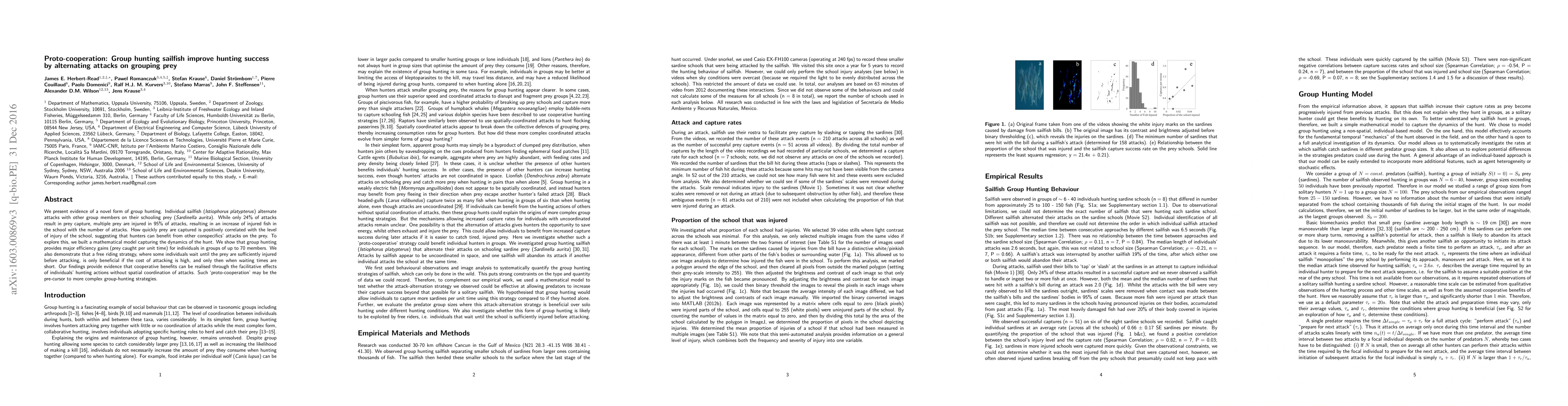 We present evidence of a novel form of group hunting. Individual sailfish (Istiophorus platypterus) alternate attacks with other group members on their schooling prey (Sardinella aurita). While only 24% of attacks result in prey capture, multiple prey are injured in 95% of attacks, resulting in an increase of injured fish in the school with the number of attacks. How quickly prey are captured is positively correlated with the level of injury of the school, suggesting that hunters can benefit from other conspecifics' attacks on the prey. To explore this, we built a mathematical model capturing the dynamics of the hunt. We show that group hunting provides major efficiency gains (prey caught per unit time) for individuals in groups of up to 70 members. We also demonstrate that a free riding strategy, where some individuals wait until the prey are sufficiently injured before attacking, is only beneficial if the cost of attacking is high, and only then when waiting times are short. Our findings provide evidence that cooperative benefits can be realised through the facilitative effects of individuals' hunting actions without spatial coordination of attacks. Such "proto-cooperation" may be the pre-cursor to more complex group-hunting strategies.