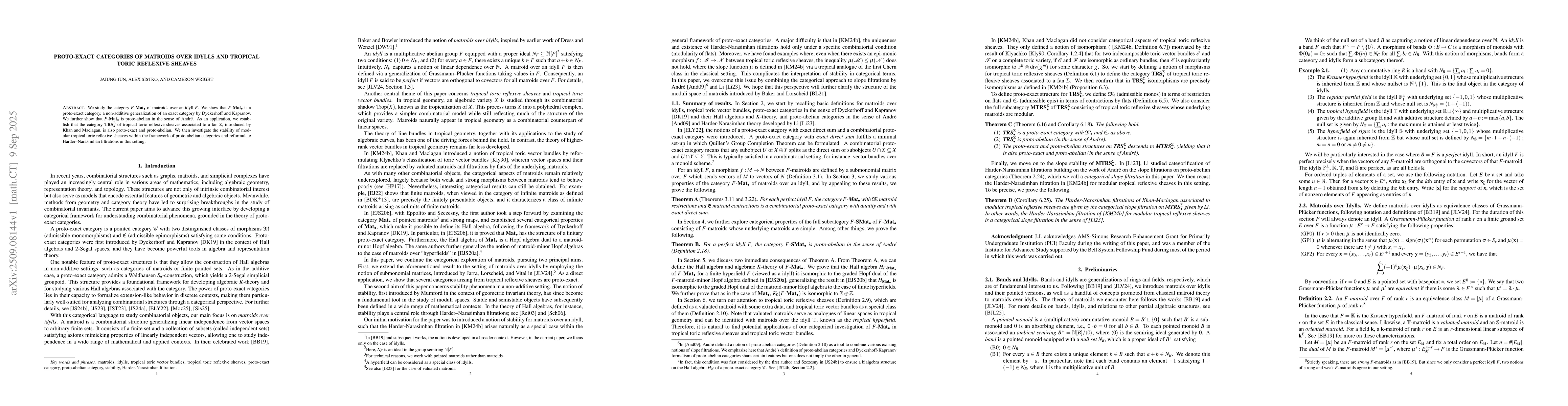 We study the category $F$-$\textbf{Mat}_\bullet$ of matroids over an idyll $F$. We show that $F$-$\textbf{Mat}_\bullet$ is a proto-exact category, a non-additive generalization of an exact category by Dyckerhoff and Kapranov. We further show that $F$-$\textbf{Mat}_\bullet$ is proto-abelian in the sense of Andr\'e. As an application, we establish that the category $\textbf{TRS}_\bullet^\Sigma$ of tropical toric reflexive sheaves associated to a fan $\Sigma$, introduced by Khan and Maclagan, is also proto-exact and proto-abelian. We then investigate the stability of modular tropical toric reflexive sheaves within the framework of proto-abelian categories and reformulate Harder-Narasimhan filtrations in this setting.