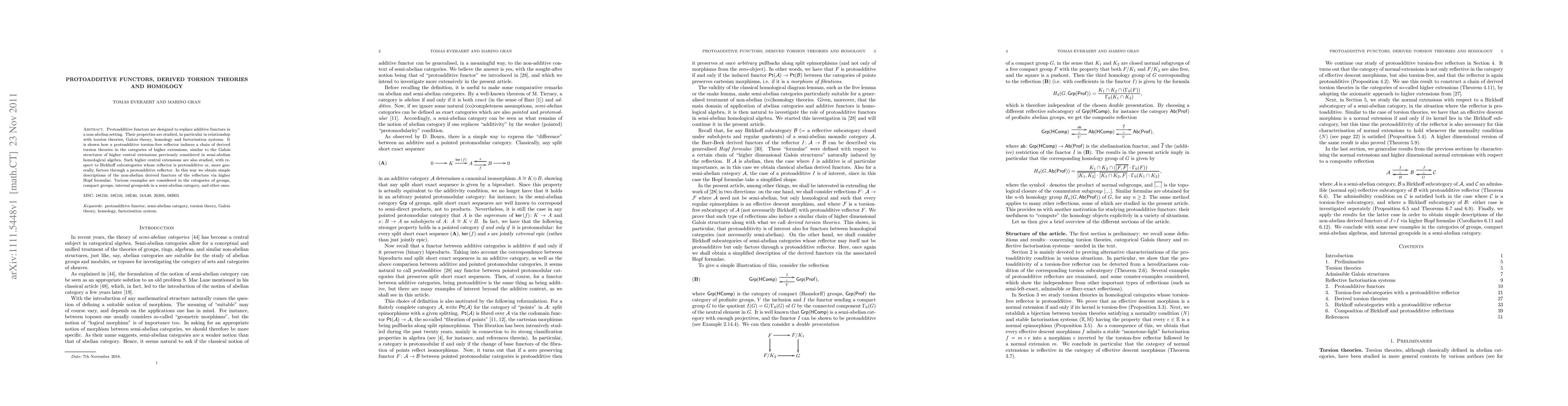 This paper explores protoadditive functors as substitutes for additive functors in non-abelian contexts, examining their connection to torsion theories, Galois theory, and homology. It demonstrates how protoadditive torsion-free reflectors generate derived torsion theories akin to higher central extensions in semi-abelian homological algebra, providing simple descriptions of non-abelian derived functors through higher Hopf formulae.