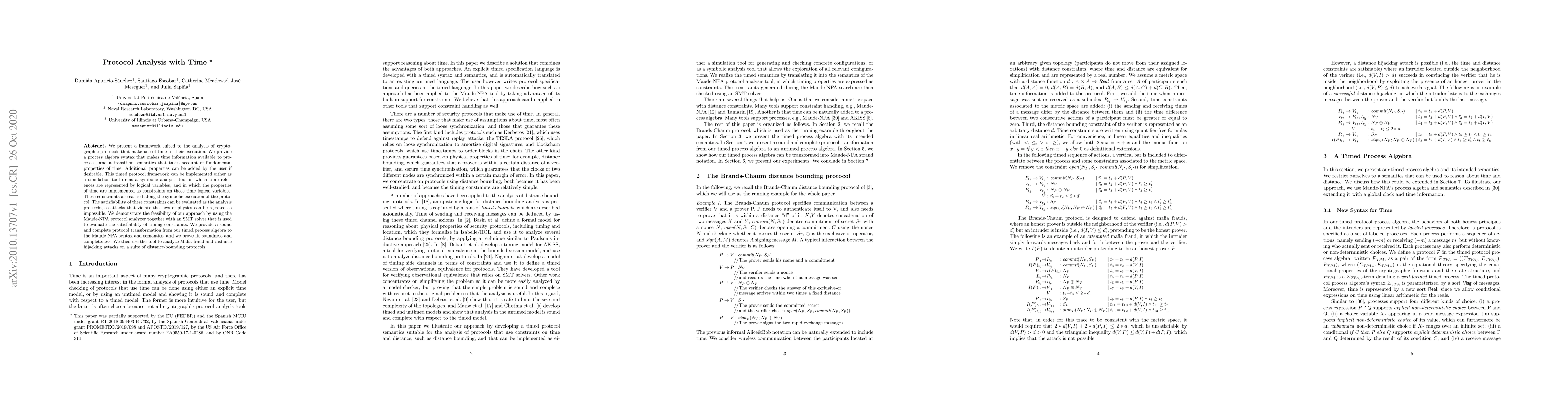 Researchers develop a framework for analyzing cryptographic protocols that utilize time in their execution, allowing analysis to consider physical laws and reject attacks that violate them. The approach provides a sound and complete protocol transformation tool for evaluating the security of distance-bounding protocols against Mafia fraud and distance hijacking attacks.
