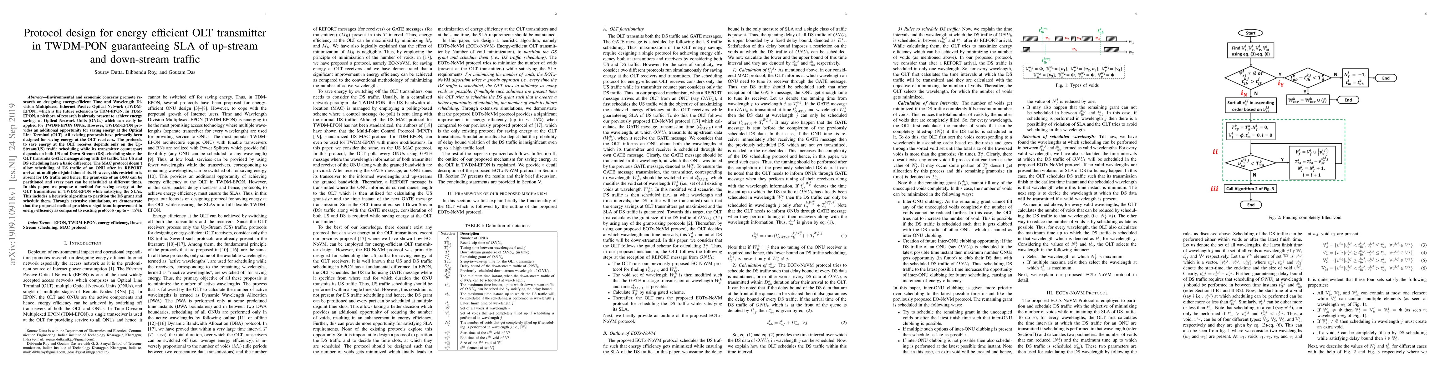 This paper proposes a protocol for energy-efficient OLT transmitters in TWDM-EPON, focusing on optimizing Down-Stream traffic scheduling. The method includes a heuristic algorithm to partition DS grants, achieving up to 45% energy efficiency improvement while meeting Service Level Agreements (SLAs).
