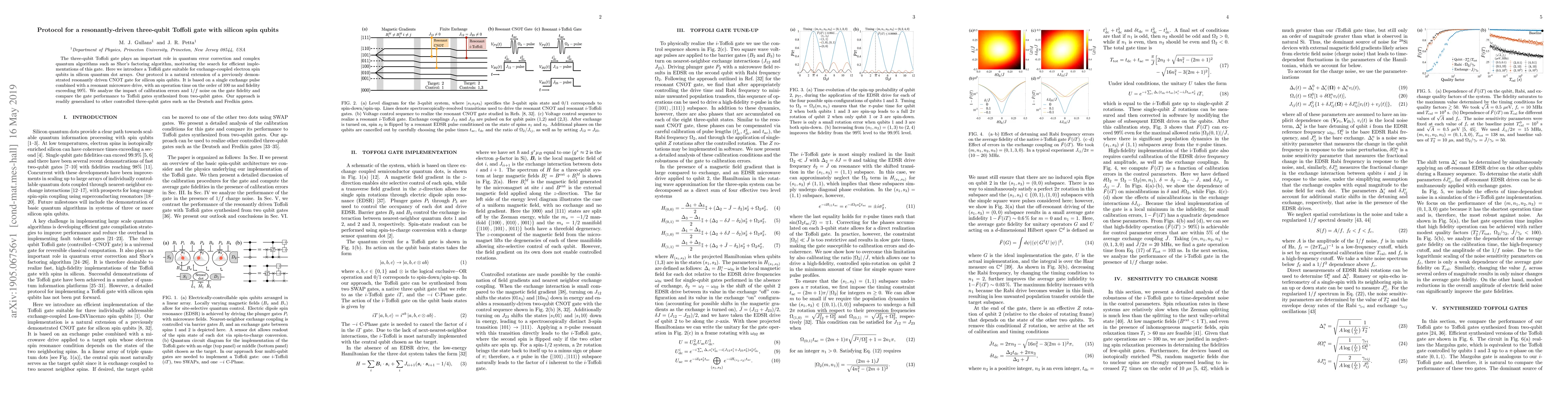 The three-qubit Toffoli gate plays an important role in quantum error correction and complex quantum algorithms such as Shor's factoring algorithm, motivating the search for efficient implementations of this gate. Here we introduce a Toffoli gate suitable for exchange-coupled electron spin qubits in silicon quantum dot arrays. Our protocol is a natural extension of a previously demonstrated resonantly driven CNOT gate for silicon spin qubits. It is based on a single exchange pulse combined with a resonant microwave drive, with an operation time on the order of 100 ns and fidelity exceeding 99%. We analyze the impact of calibration errors and 1/f noise on the gate fidelity and compare the gate performance to Toffoli gates synthesized from two-qubit gates. Our approach is readily generalized to other controlled three-qubit gates such as the Deutsch and Fredkin gates.