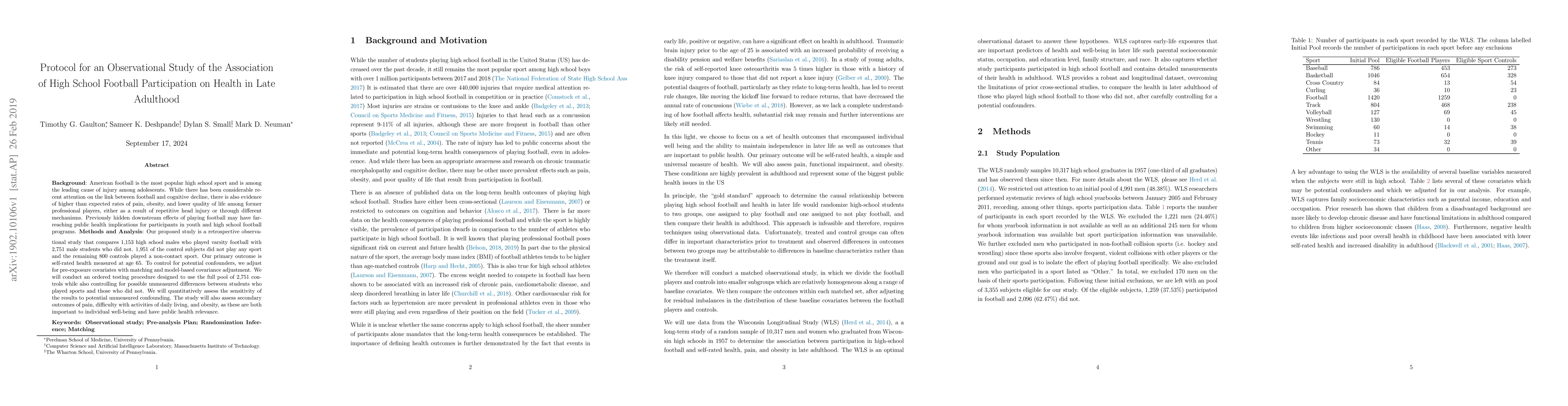 American football is the most popular high school sport and is among the leading cause of injury among adolescents. While there has been considerable recent attention on the link between football and cognitive decline, there is also evidence of higher than expected rates of pain, obesity, and lower quality of life among former professional players, either as a result of repetitive head injury or through different mechanisms. Previously hidden downstream effects of playing football may have far-reaching public health implications for participants in youth and high school football programs. Our proposed study is a retrospective observational study that compares 1,153 high school males who played varsity football with 2,751 male students who did not. 1,951 of the control subjects did not play any sport and the remaining 800 controls played a non-contact sport. Our primary outcome is self-rated health measured at age 65. To control for potential confounders, we adjust for pre-exposure covariates with matching and model-based covariance adjustment. We will conduct an ordered testing procedure designed to use the full pool of 2,751 controls while also controlling for possible unmeasured differences between students who played sports and those who did not. We will quantitatively assess the sensitivity of the results to potential unmeasured confounding. The study will also assess secondary outcomes of pain, difficulty with activities of daily living, and obesity, as these are both important to individual well-being and have public health relevance.
