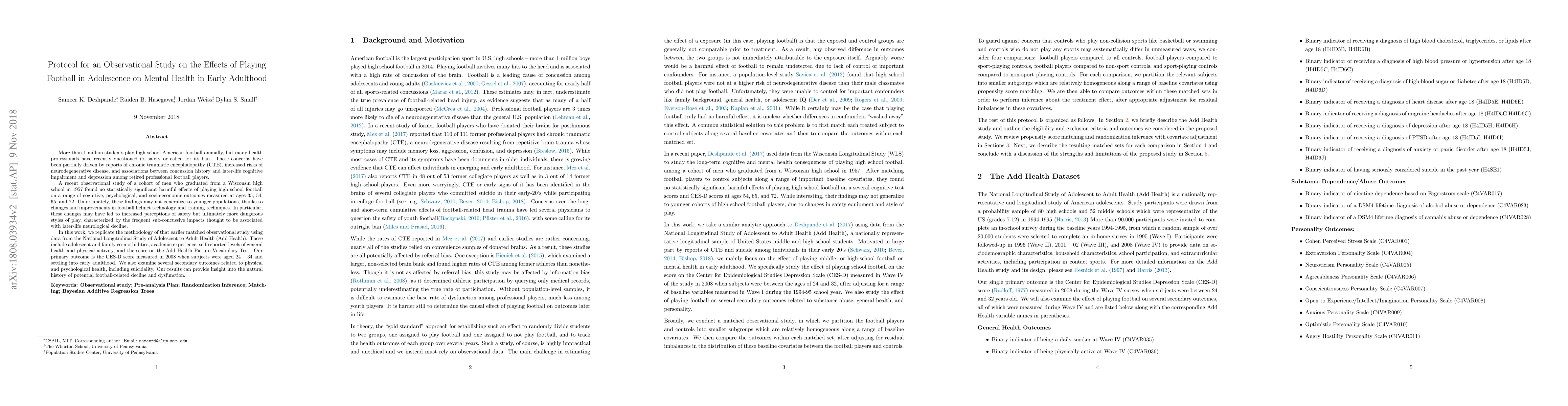 This study aims to investigate the long-term mental health effects of playing high school American football in adolescence using data from the National Longitudinal Study of Adolescent to Adult Health (Add Health). The primary outcome is the CES-D score in early adulthood, with secondary outcomes including physical and psychological health measures, to assess potential football-related cognitive and emotional decline.