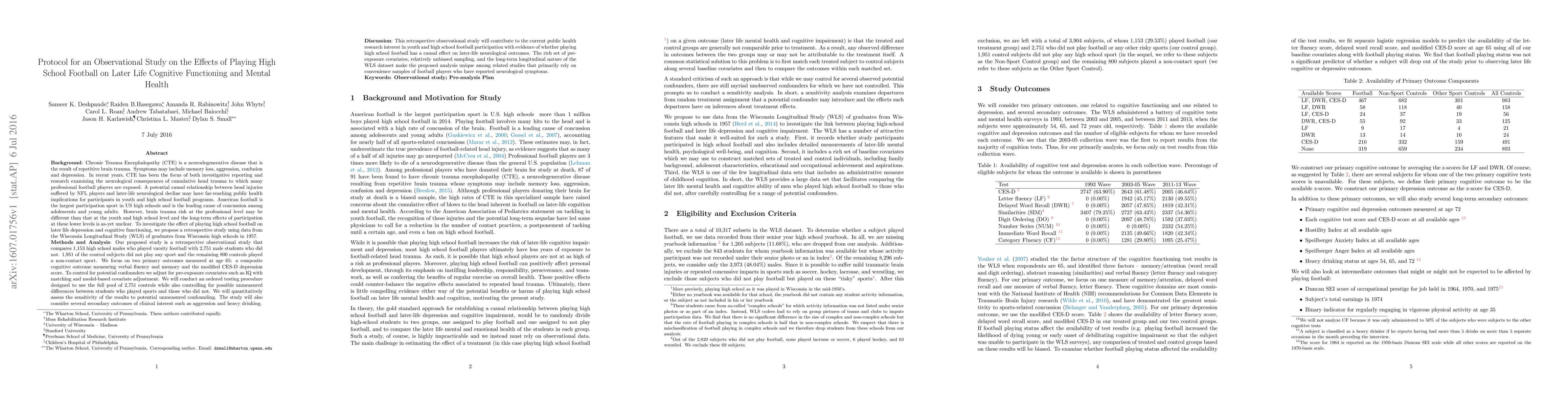 A potential causal relationship between head injuries sustained by NFL players and later-life neurological decline may have broad implications for participants in youth and high school football programs. However, brain trauma risk at the professional level may be different than that at the youth and high school levels and the long-term effects of participation at these levels is as-yet unclear. To investigate the effect of playing high school football on later life depression and cognitive functioning, we propose a retrospective observational study using data from the Wisconsin Longitudinal Study (WLS) of graduates from Wisconsin high schools in 1957. We compare 1,153 high school males who played varsity football to 2,751 male students who did not. 1,951 of the control subjects did not play any sport and the remaining 800 controls played a non-contact sport. We focus on two primary outcomes measured at age 65: a composite cognitive outcome measuring verbal fluency and memory and the modified CES-D depression score. To control for potential confounders we adjust for pre-exposure covariates such as IQ with matching and model-based covariate adjustment. We will conduct an ordered testing procedure that uses all 2,751 controls while controlling for possible unmeasured differences between students who played sports and those who did not. We will quantitatively assess the sensitivity of the results to potential unmeasured confounding. The study will also consider several secondary outcomes of clinical interest such as aggression and heavy drinking. The rich set of pre-exposure variables, relatively unbiased sampling, and longitudinal nature of the WLS dataset make the proposed analysis unique among related studies that rely primarily on convenience samples of football players with reported neurological symptoms.