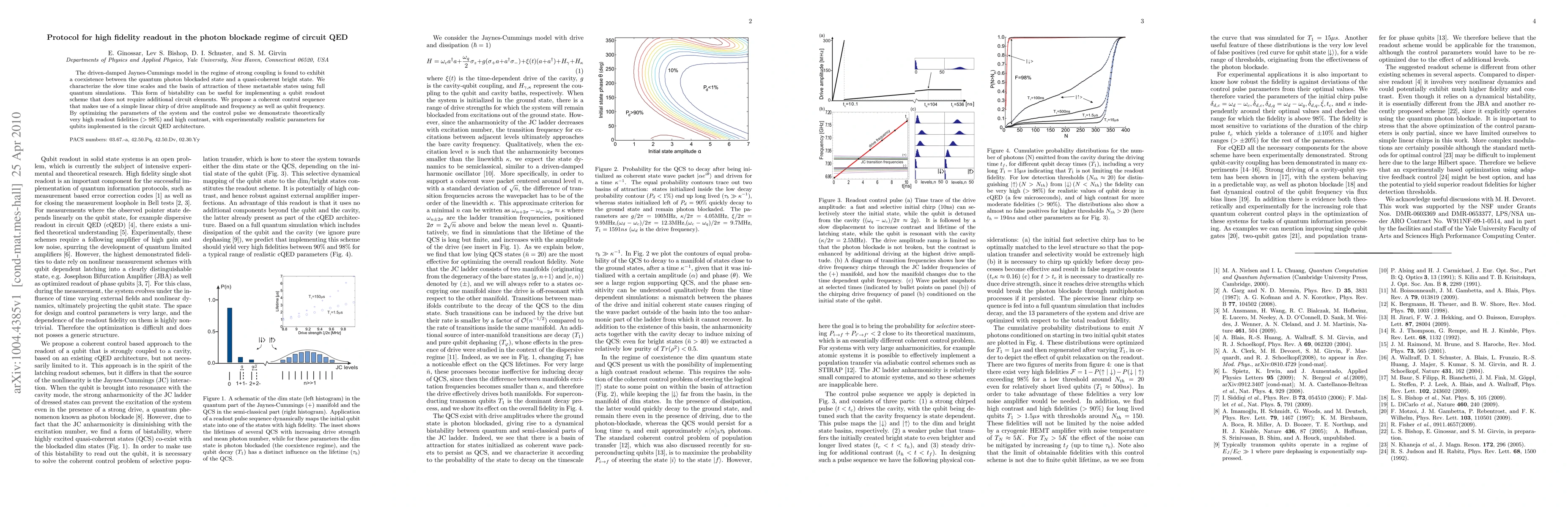 This paper proposes a protocol for high fidelity readout in circuit QED using the photon blockade regime, leveraging the coexistence of quantum photon blockaded and quasi-coherent bright states in the driven-damped Jaynes-Cummings model. A coherent control sequence with linear chirp optimization achieves theoretical readout fidelities exceeding 98% under realistic experimental conditions.