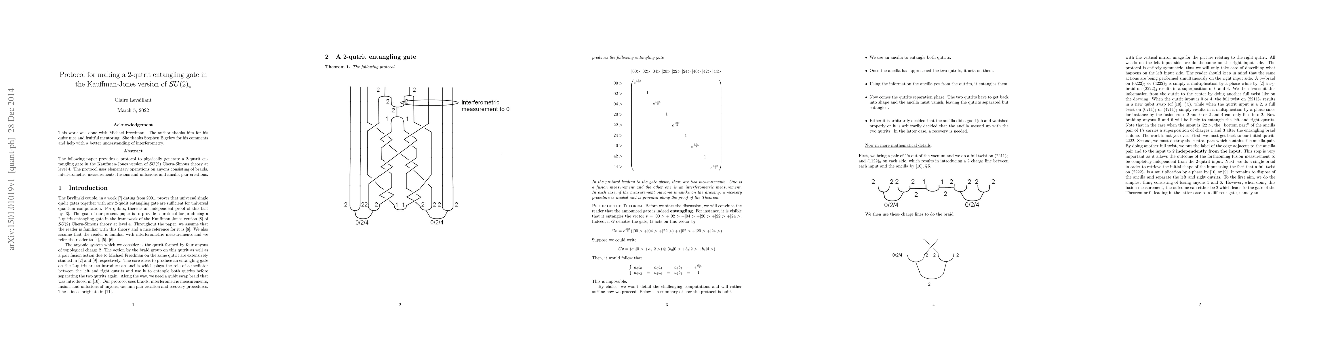 Researchers developed a protocol to generate a 2-qutrit entangling gate in Kauffman-Jones SU(2)_4 Chern-Simons theory using braids, interferometric measurements, fusions, and ancilla pair creation.
