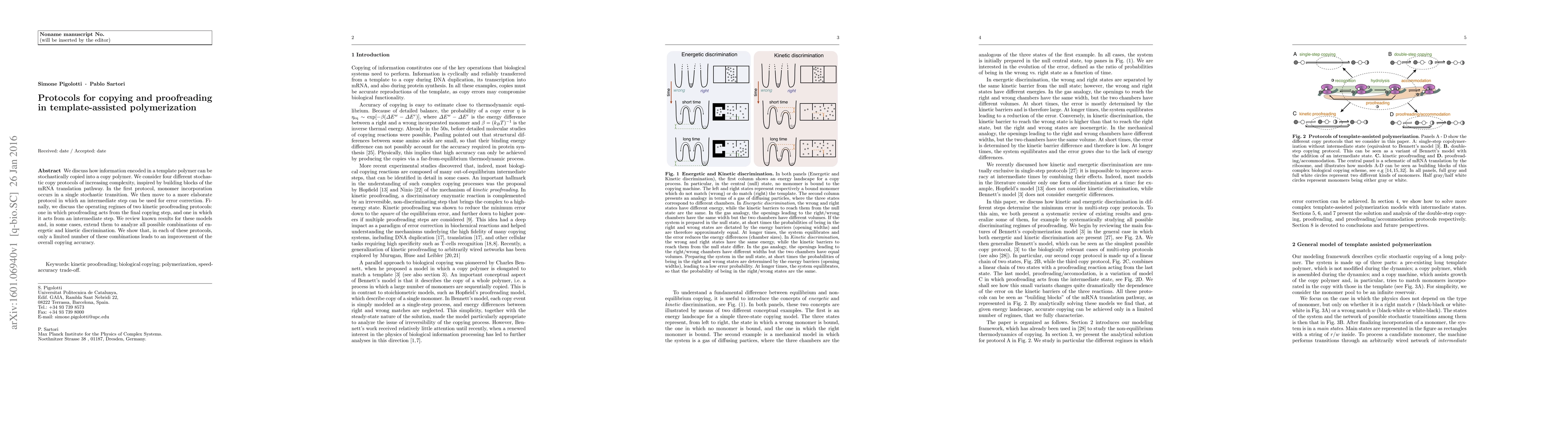 This paper explores four stochastic protocols for copying information from a template polymer to a copy polymer, inspired by mRNA translation. It discusses error correction in intermediate steps and analyzes two kinetic proofreading protocols. The study finds that only specific combinations of energetic and kinetic discrimination improve overall copying accuracy.