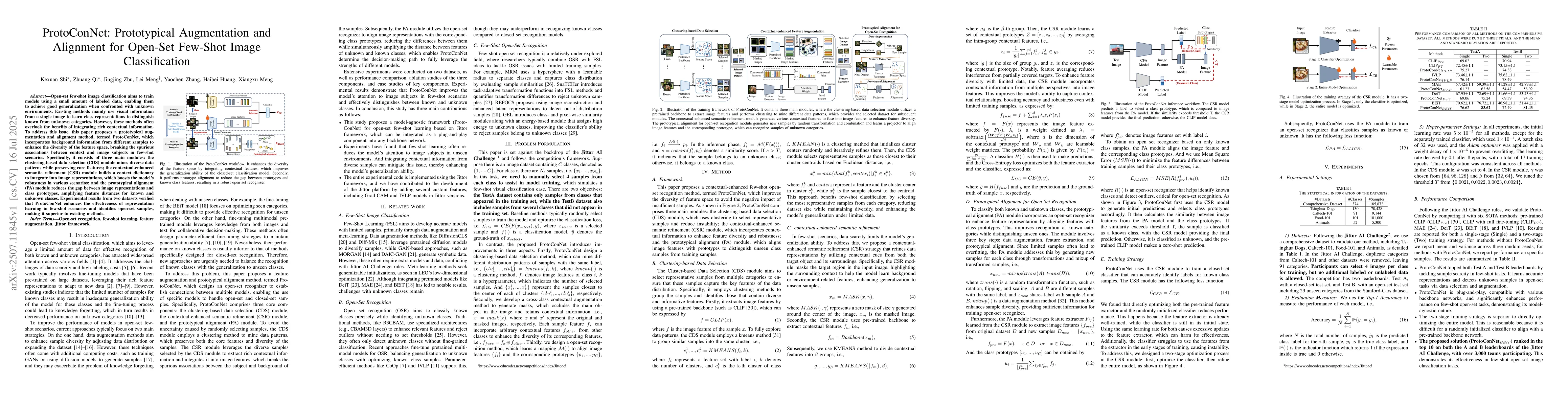 Open-set few-shot image classification aims to train models using a small amount of labeled data, enabling them to achieve good generalization when confronted with unknown environments. Existing methods mainly use visual information from a single image to learn class representations to distinguish known from unknown categories. However, these methods often overlook the benefits of integrating rich contextual information. To address this issue, this paper proposes a prototypical augmentation and alignment method, termed ProtoConNet, which incorporates background information from different samples to enhance the diversity of the feature space, breaking the spurious associations between context and image subjects in few-shot scenarios. Specifically, it consists of three main modules: the clustering-based data selection (CDS) module mines diverse data patterns while preserving core features; the contextual-enhanced semantic refinement (CSR) module builds a context dictionary to integrate into image representations, which boosts the model's robustness in various scenarios; and the prototypical alignment (PA) module reduces the gap between image representations and class prototypes, amplifying feature distances for known and unknown classes. Experimental results from two datasets verified that ProtoConNet enhances the effectiveness of representation learning in few-shot scenarios and identifies open-set samples, making it superior to existing methods.